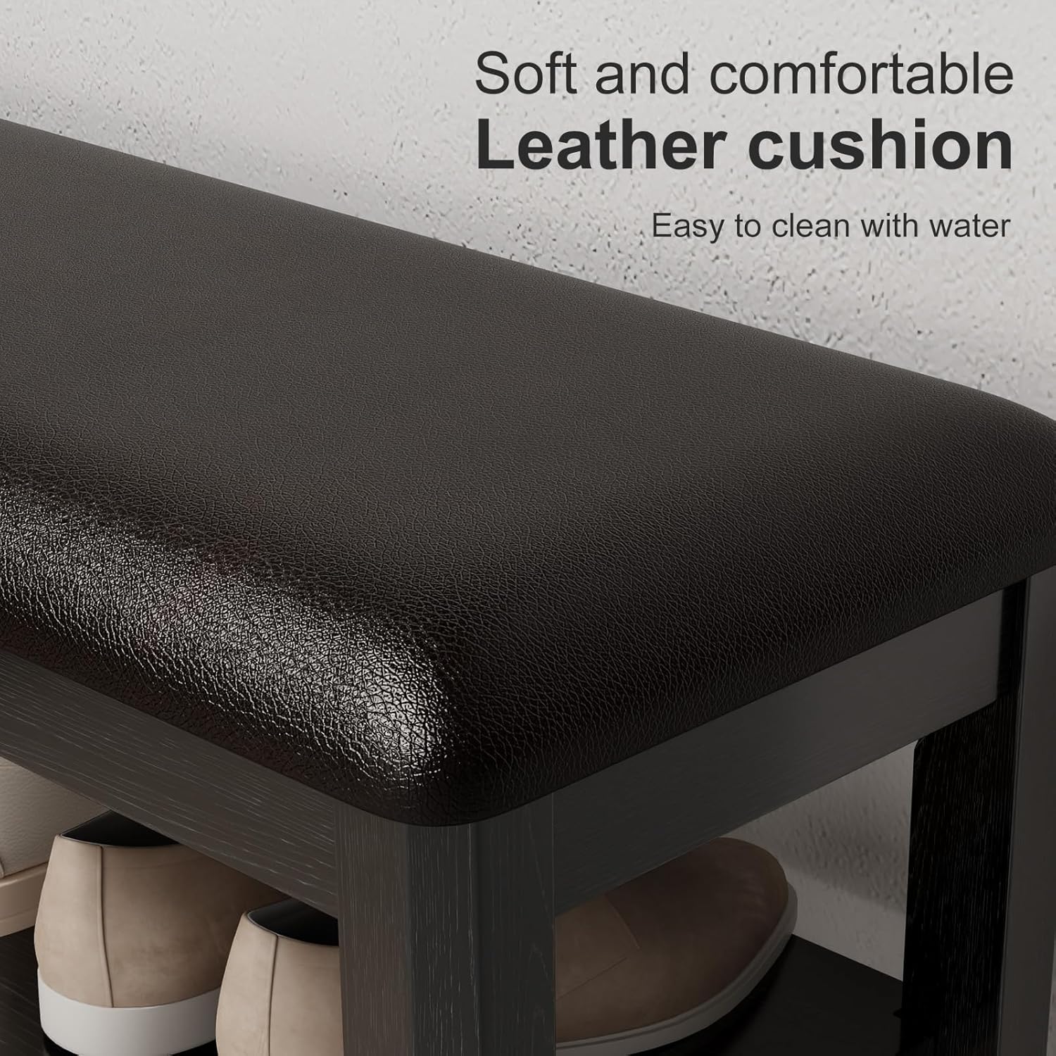 - Premium PU Leather Cushion:Equipped with a high-quality PU leather cushion, this shoe bench is abrasion-resistant, fade-resistant, and water-resistant. It offers a luxurious and comfortable seating experience for daily use.