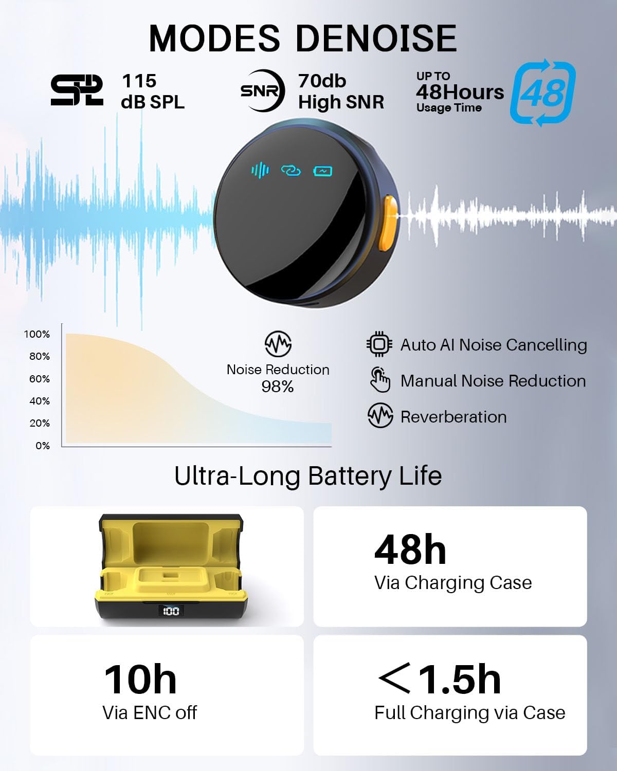 - 3 Advanced Noise-Reduction Modes : The Q18 Wireless lapel mic features three advanced noise-reduction modes—AI auto, manual adjustment, and reverberation—powered by an intelligent chip to isolate vocals and eliminate background noise. Perfect for podcasts, videos, or loud settings