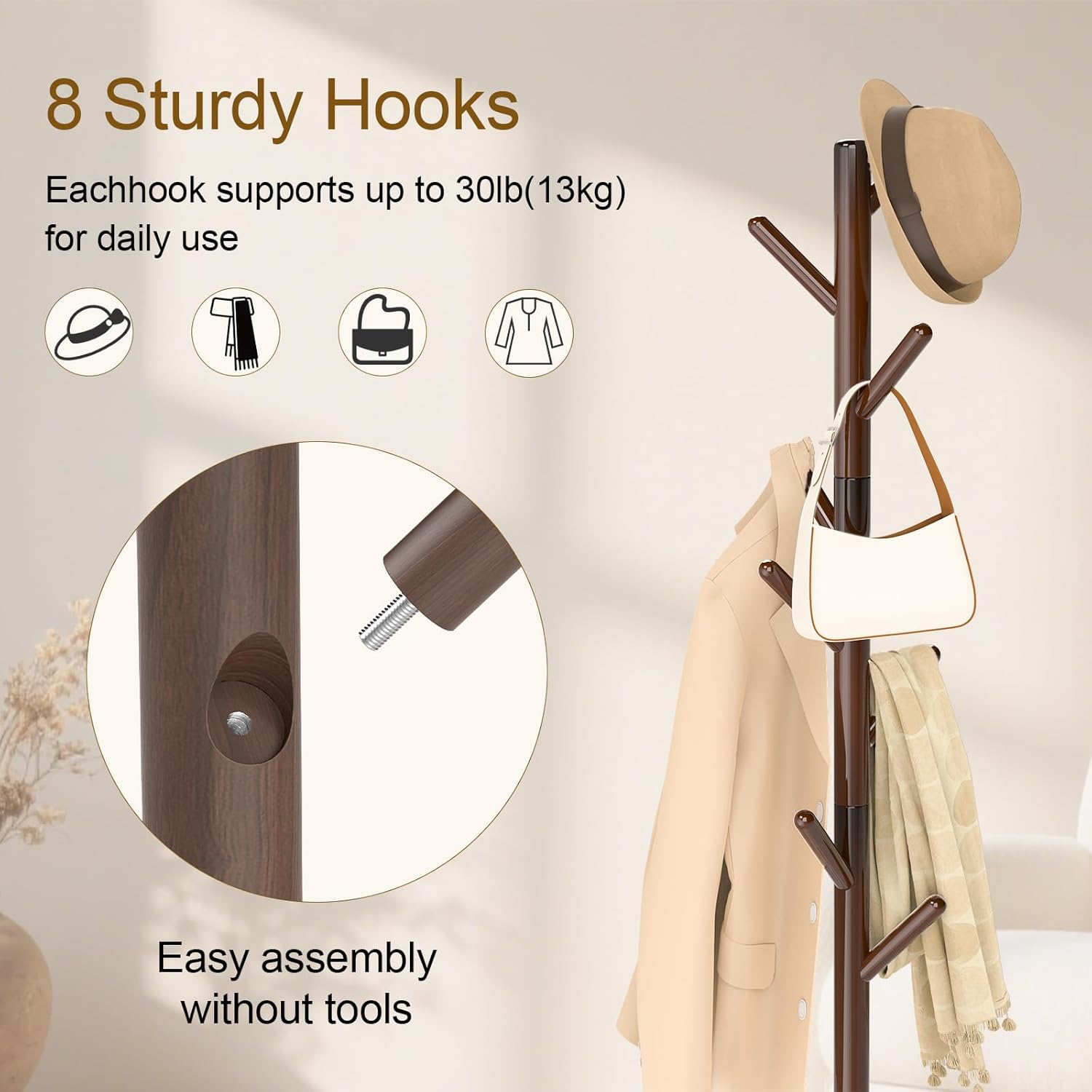 - Easy Assembly: The coat stand rack is easy to assemble by one people and the all required accessories are included. All you need to do is attach the pole onto the square base, then screw the branches on