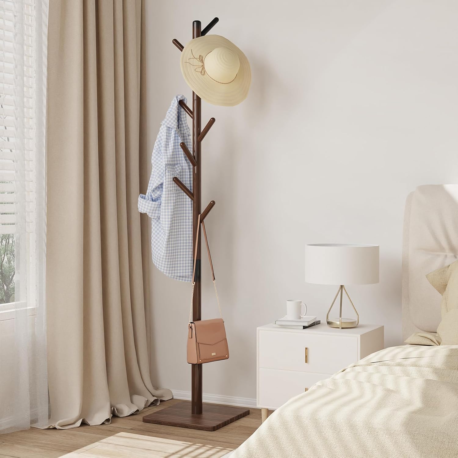 - Optimal Stability: Crafted of solid rubberwood, this coat rack is robust like a tree with its large square base, thick trunk for strong support, and rounded branches to hold up, offering a stable home for your clothes and hats