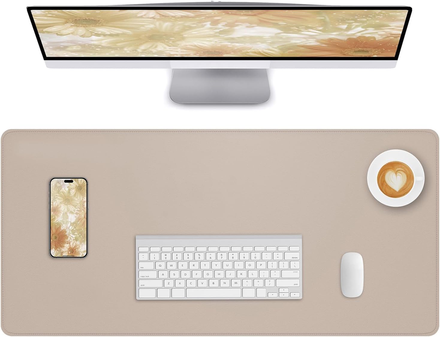Large Desk Mouse Pad Protector, Stitched Locking Edge Non-Slip PU Leather Desk Mat Laptop Table Pad Blotter, Waterproof Durable Writing Pad for Office and Home (Beige, 90 x 43cm)