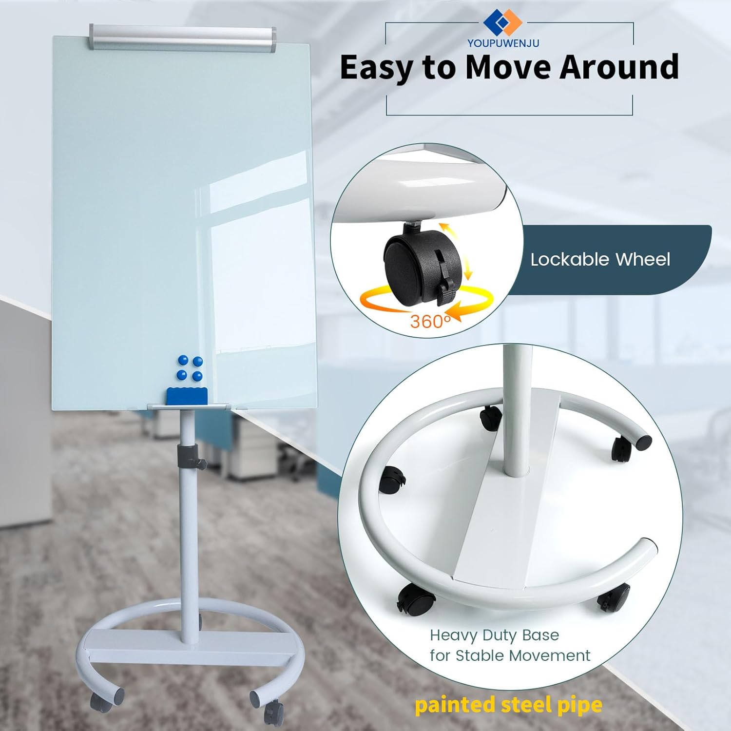 Rolling Writeboard Premium Tempered Magnetic Glass Whiteboard 40"x28" Rolling Dry Erase Board with Tempered Glass Surface Adjustable Height Multi-Use Standing (White)
