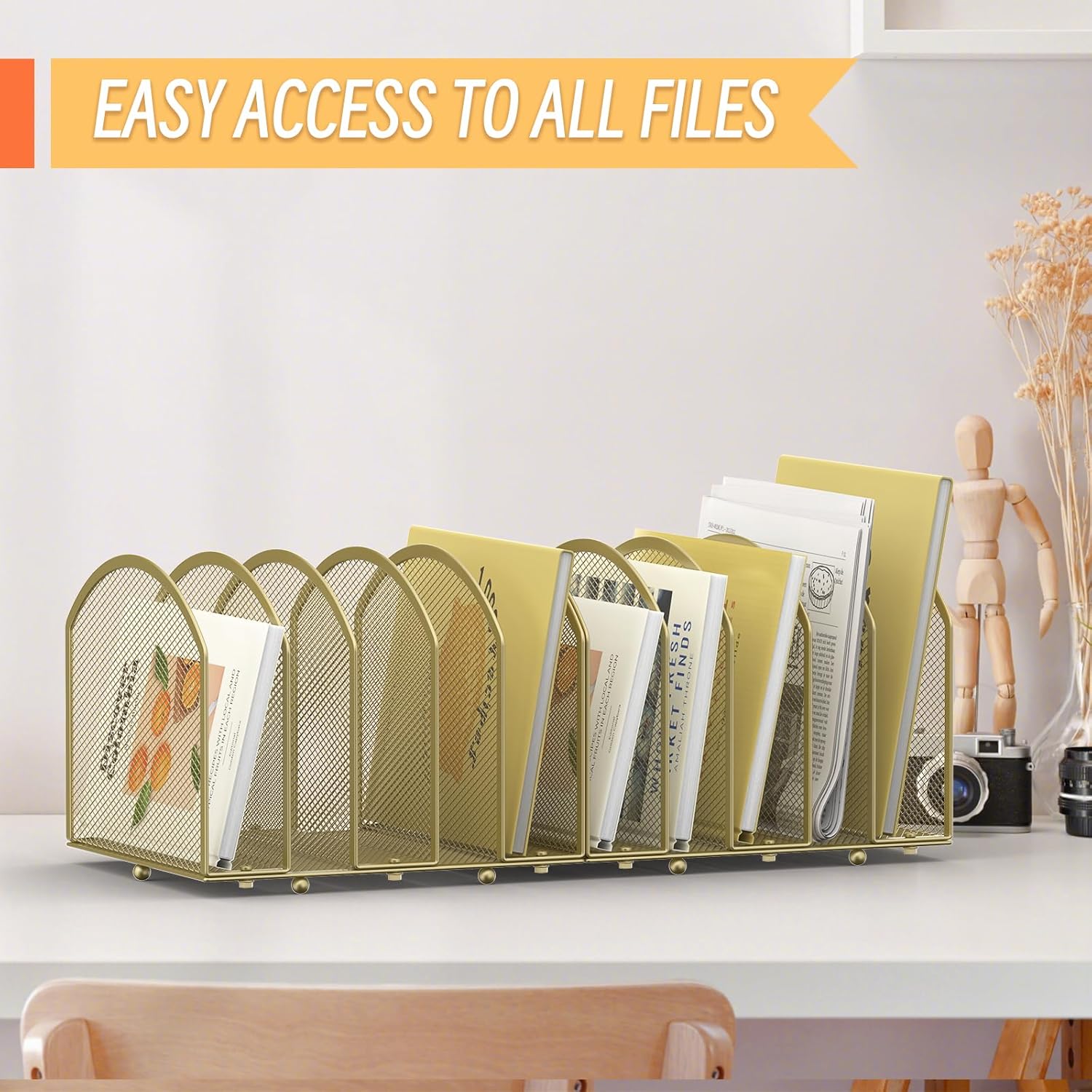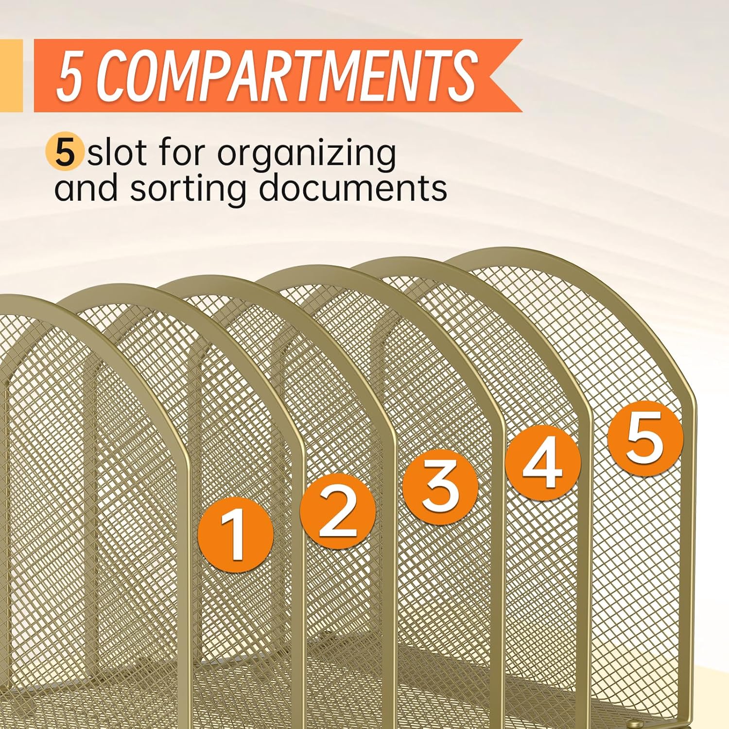 Desk File Organizer 5 Sections Desktop Organizer File Sorter Office Organization File Folder Holder for Office School & Classroom (Gold, 5 Section - 1Pack)