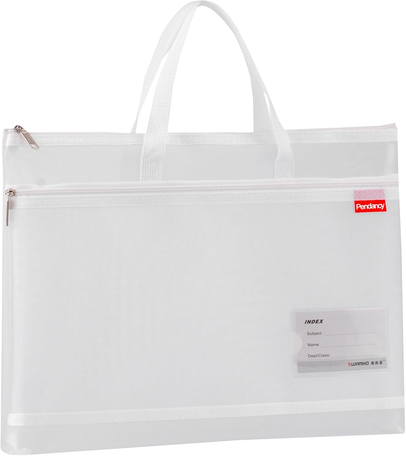 Pendancy Mesh Zipper Pouch A3 Size, Large Double Pocket Lightweight Nylon Transparent File Bag with Handle, 13x17 in Foldable Document Storage for Puzzle Project/Cross Stitch/Travel/Office (White)