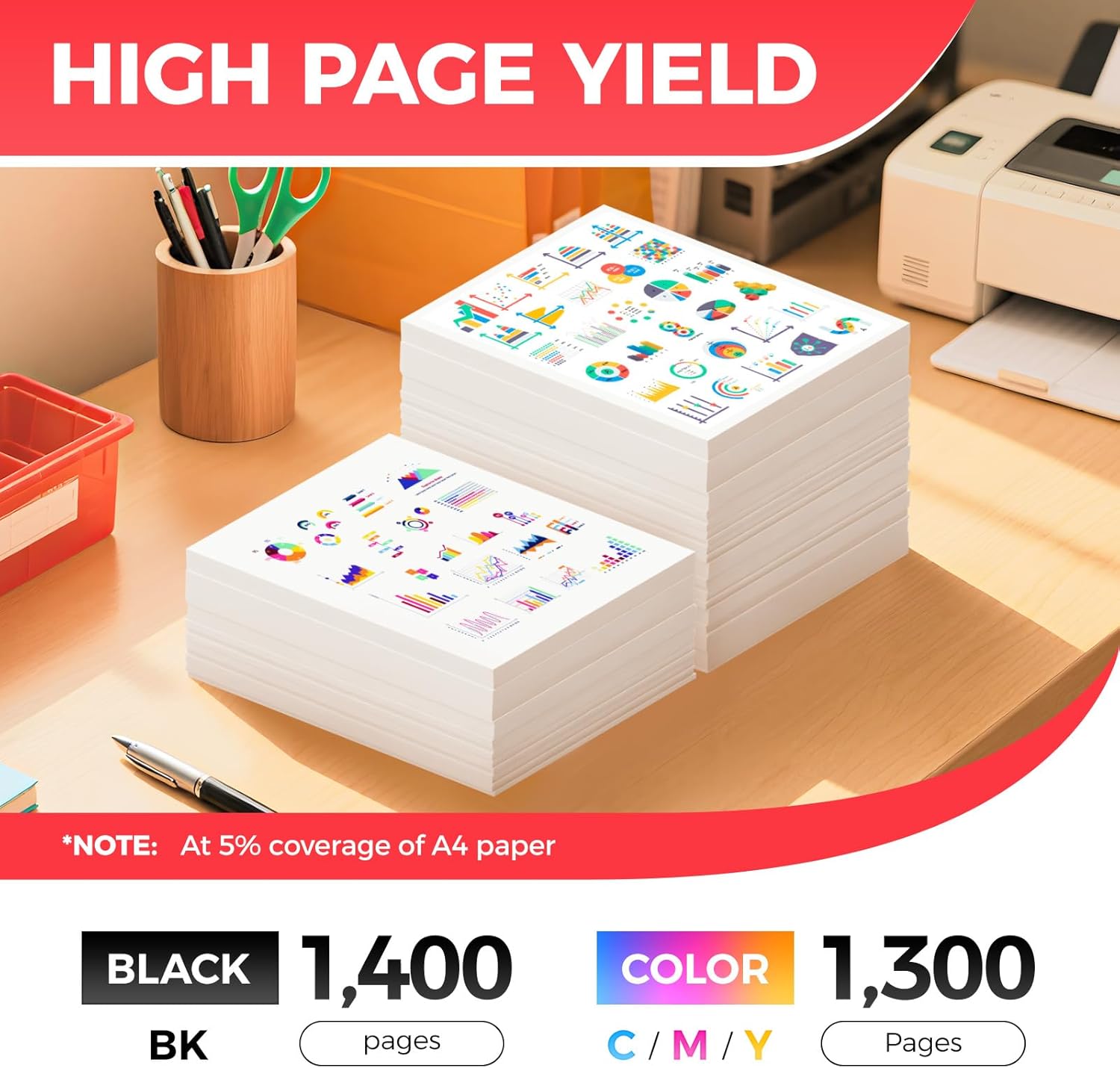 - High-Yield: up to 1,400 pages per 045/045H Black and 1,300 pages per 045/045H Color (Total 5,300 pages, 5% coverage).