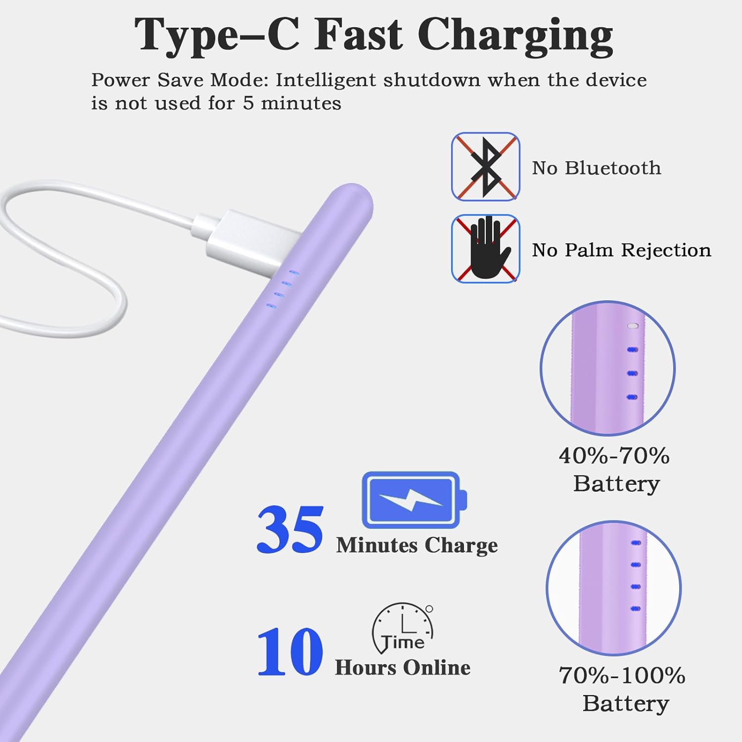 - ăType-C Charging and Indicator Lightă: Our android pen for tablet for cell phone has a standard Type-C charging port and four indicator lights, so you can check the battery level and charge it at any time. This stylus pens for touch screens can be fully charged in just 35 minutes and can be used continuously for more than 10 hours. Donât need to turn off it by hand, the fire tablet pen will auto-fall asleep after idle for 5 minutes to save power