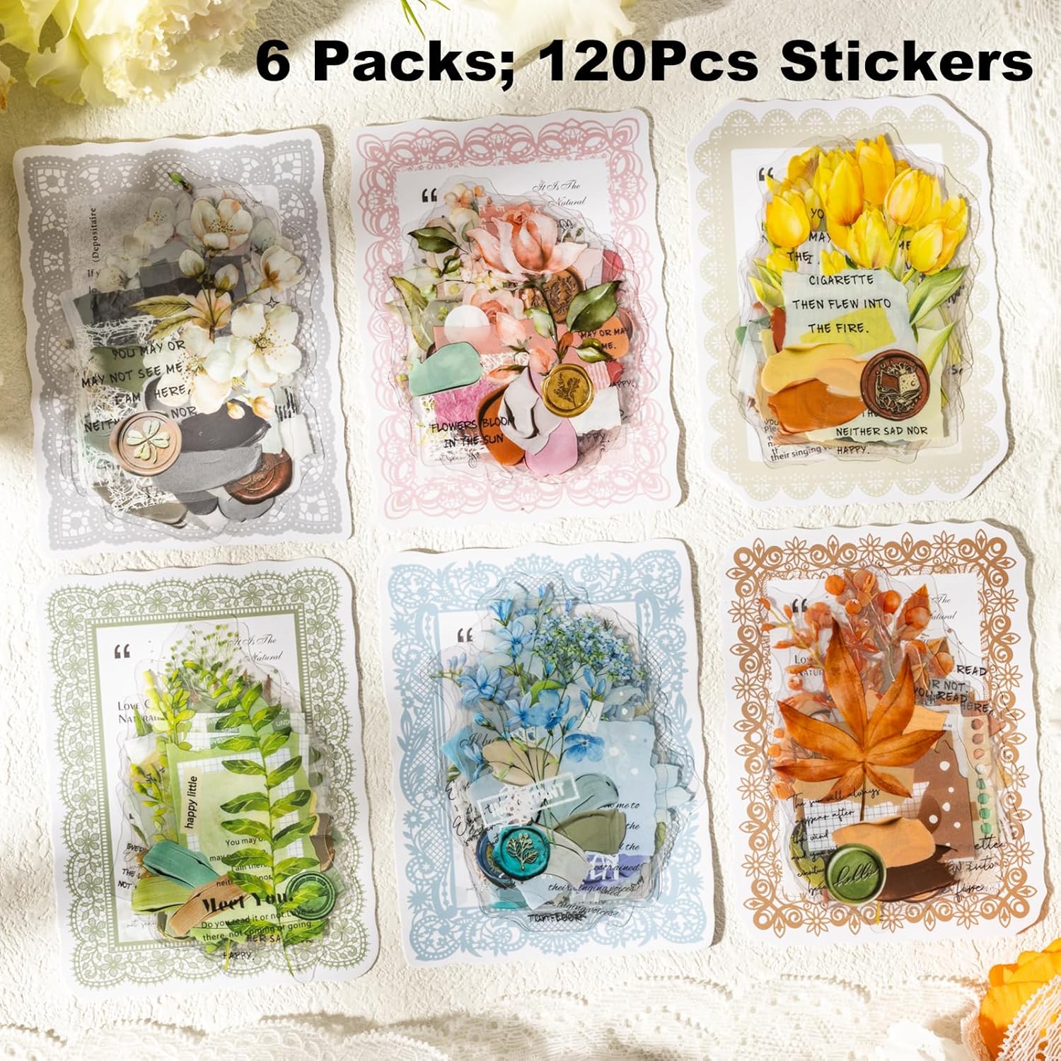 - Vintage Botanical Collage Design: This set includes 120PCS stickers, featuring delicate flowers, leaves, and vintage text elements. With 6 themes and 10 designs per set, these stickers bring an artistic and nostalgic touch to your scrapbook, journal, and DIY crafts