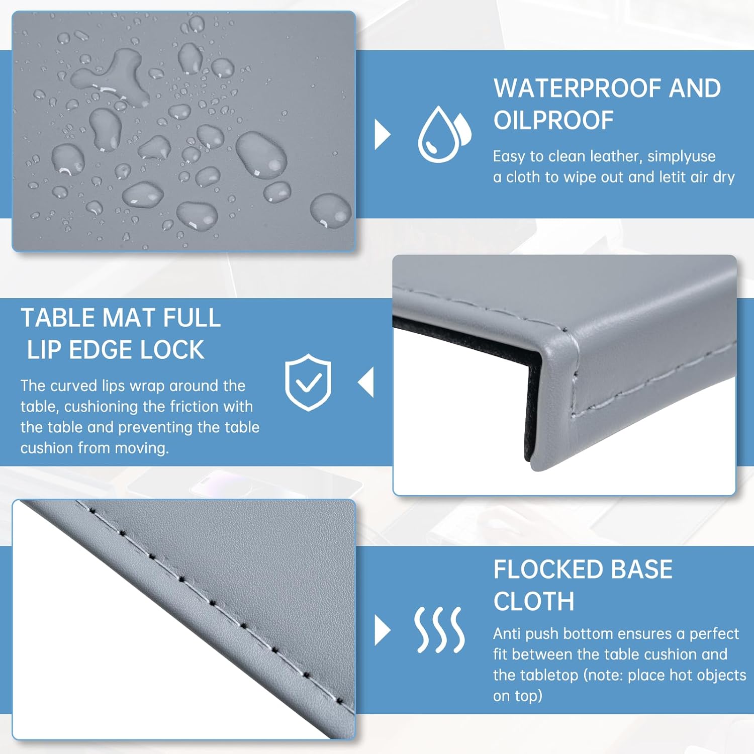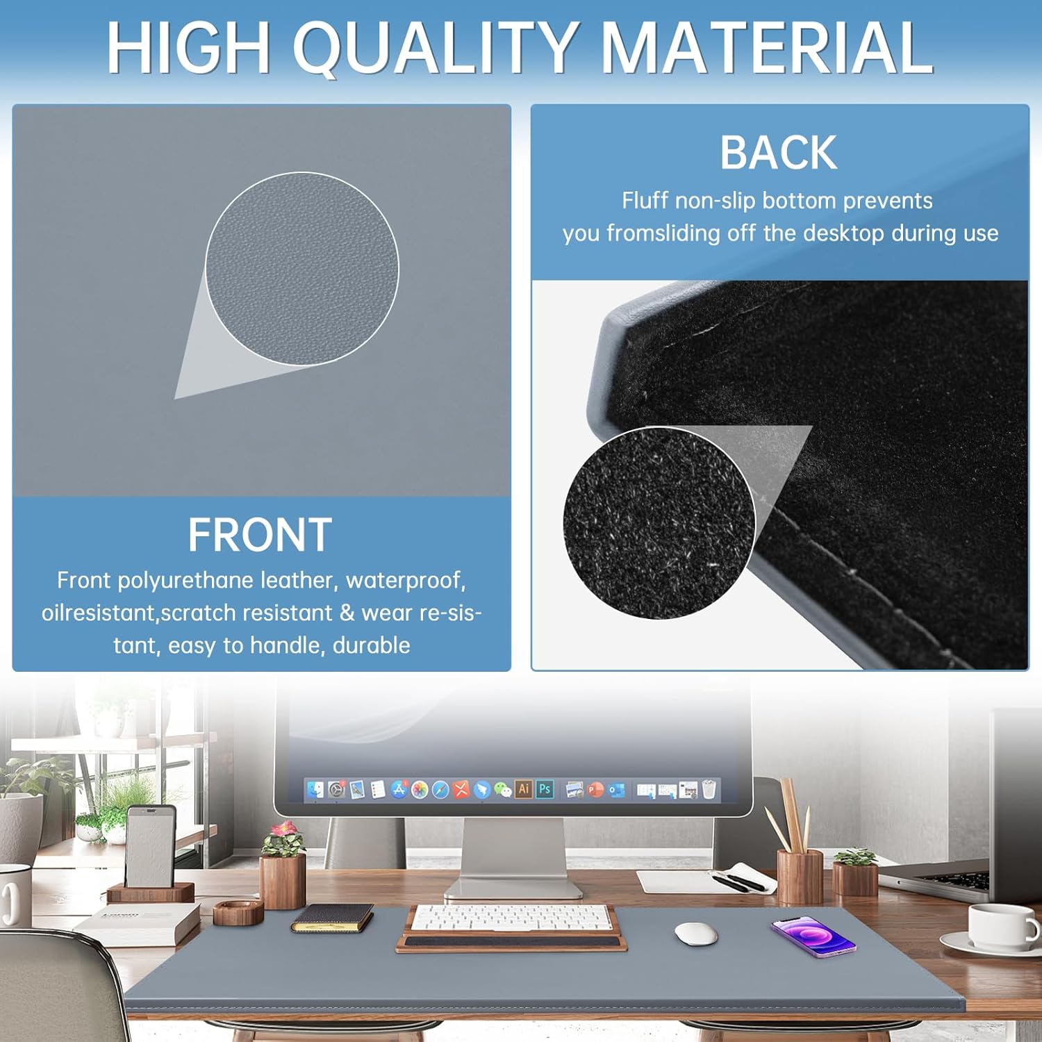 - 【Material】4 layers,first:PU,which make it smooth and soft;Second:hard pvc,which can fixed shape;Third:spunlace,which can it more thick and hard;Last layer is Flocked base fabric,This is anti-push bottom,so the desk mat can close to the table perfectly