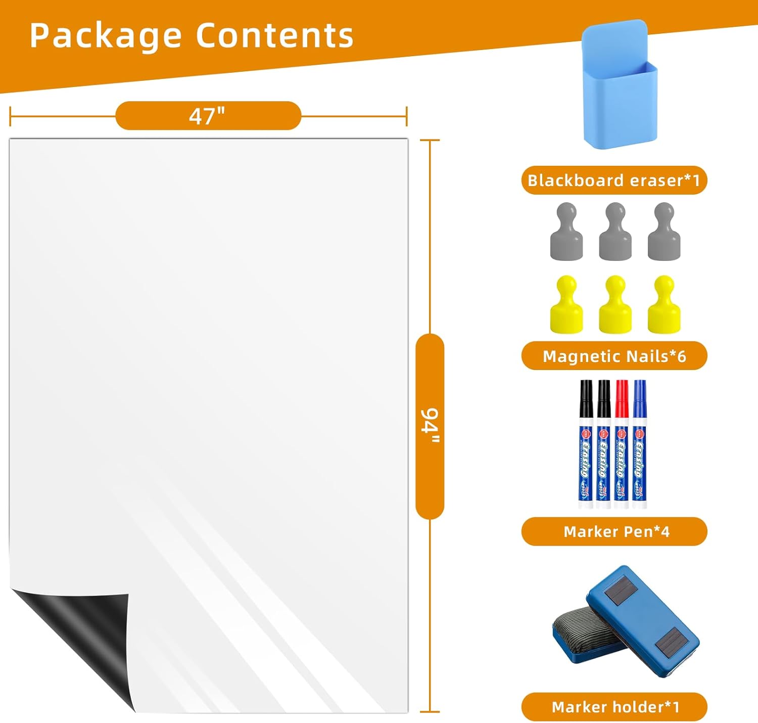 Magnetic Whiteboard Contact Paper, 47" x 94" Stick on Magnetic Dry Erase White Board Sticker on Wall, Easy to Write for Drawing, School, Office, Kitchen Fridge