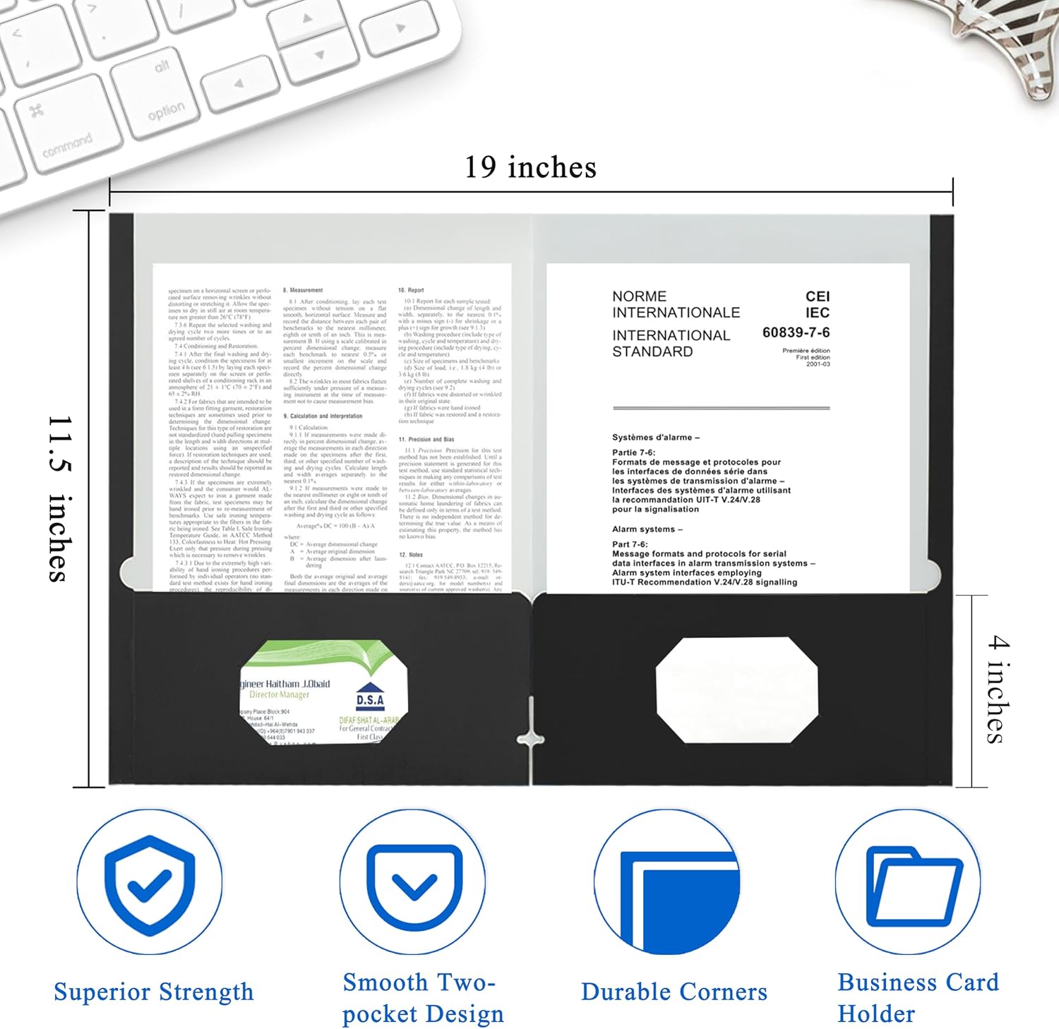- PROFESSIONAL DESIGN: Two pockets provide storage space for paper, brochures, and more. Each folders for documents measures 9" x 11.5", with two 4" pockets, holds (over 100) sheets of paper, and has a universal business card holder on the right pocket.