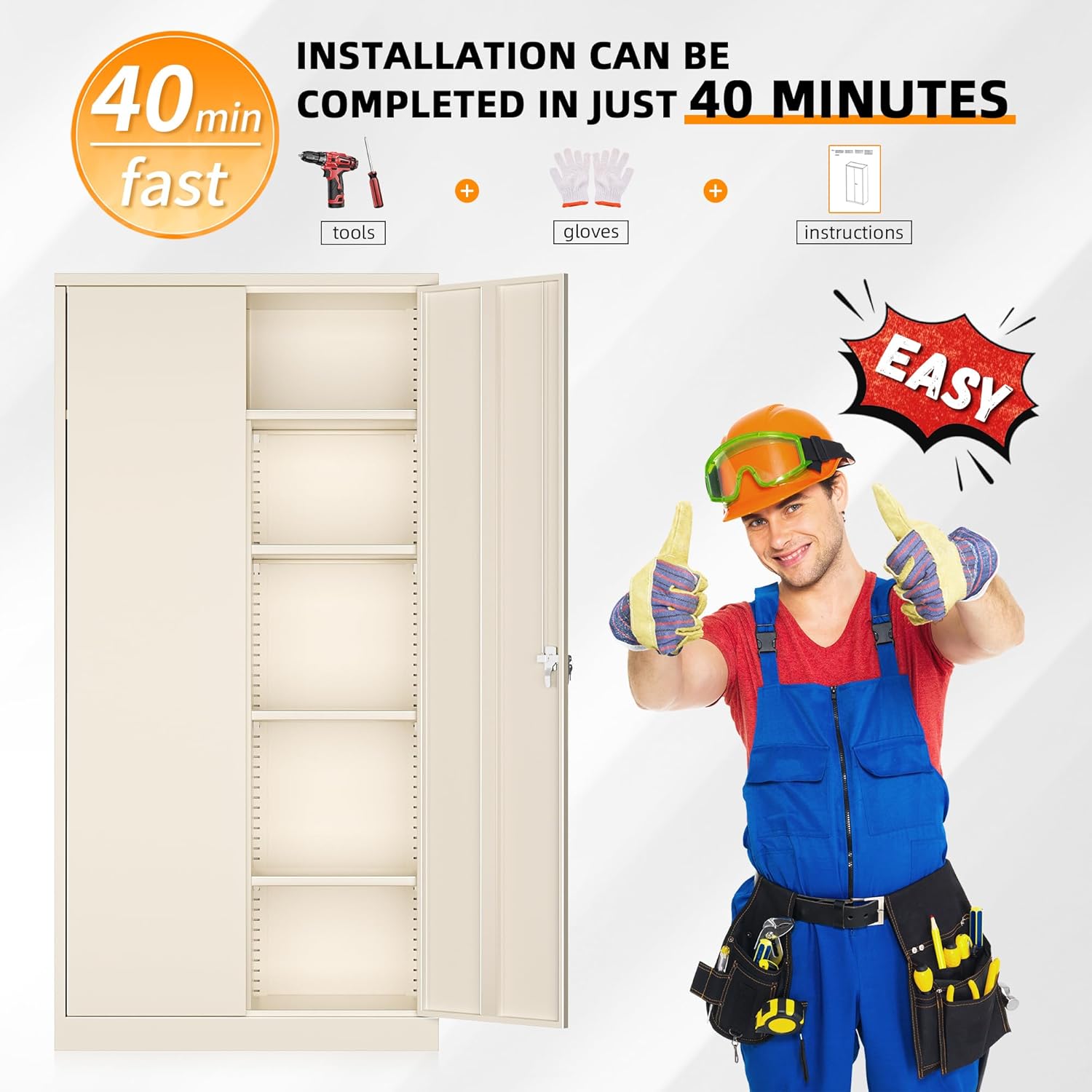 - 【Easy assembly】: Metal storage cabinet with 2 locking doors can be assembled step by step. There are 4 pre-holes on the back of the steel cabinet, you can screw it to the wall for stability.