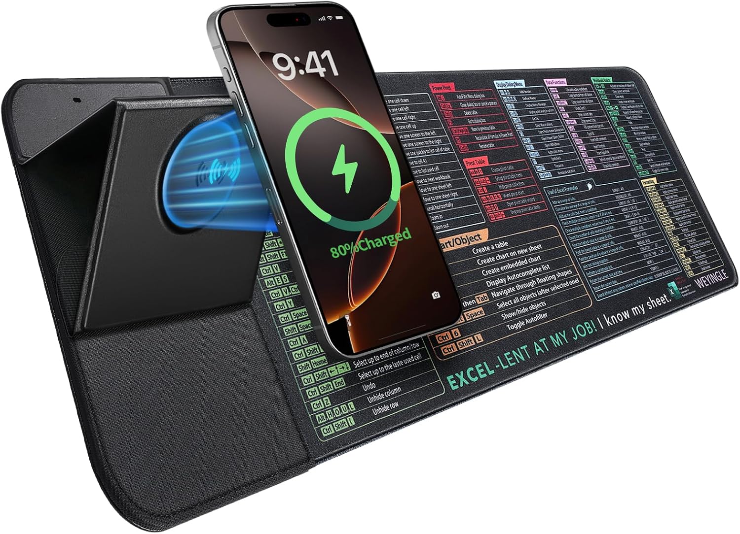 - 4-in-1 Productivity Powerhouse Combines a 15W fast wireless charger, spill-resistant desk mat, and adjustable phone stand (35Β°-360Β° angles) β charge your phone, reference Excel/Word shortcuts, and work clutter-free. Qi-certified for iPhone, Samsung, etc.