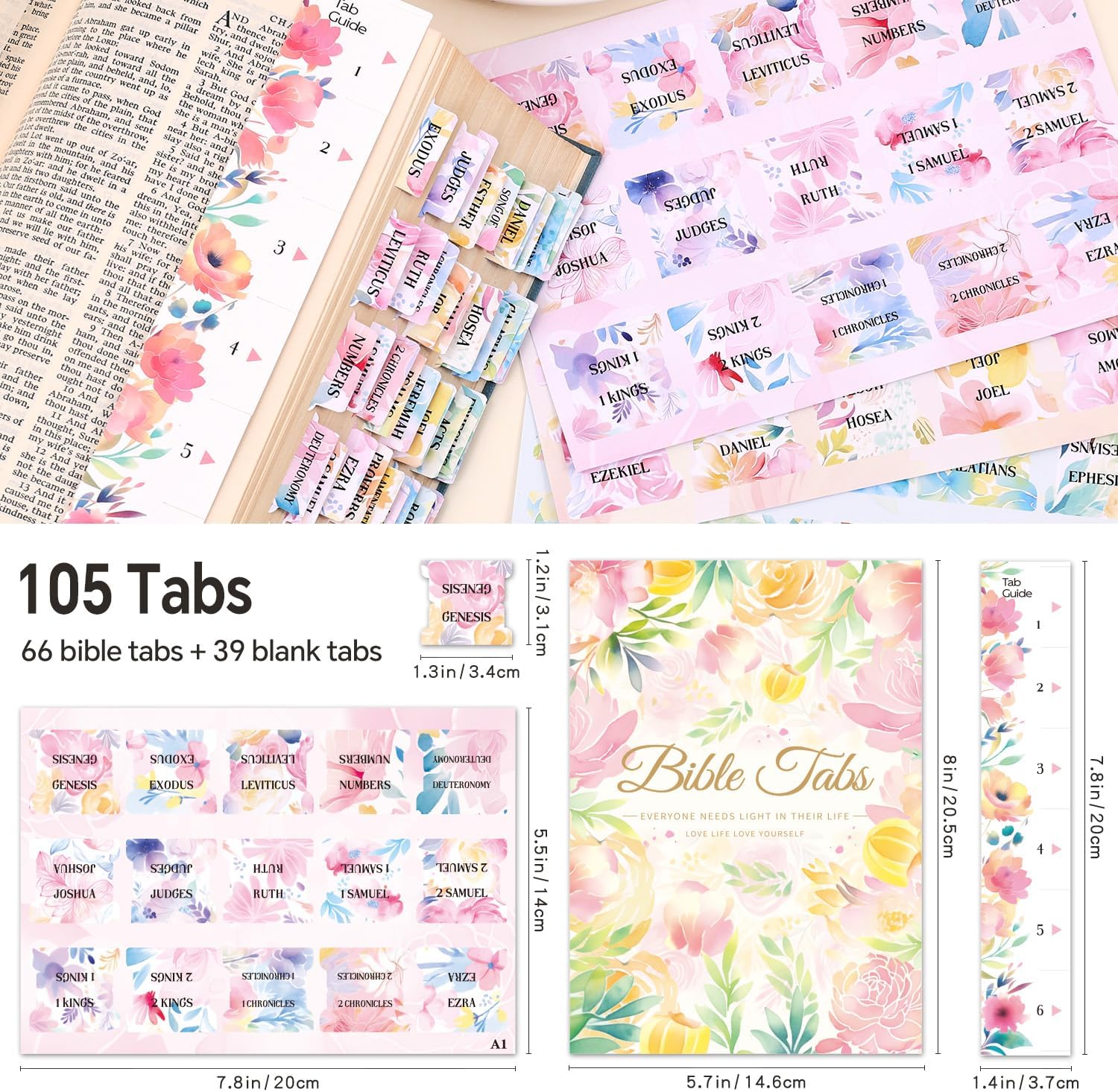 Bible Tabs for Women, 66 Large Print Laminated Bibles Chapters Index Tabs and 39 Blank Dividers Sticky Labels, Cute Beauty Bloom Bible Study Supplies, Journaling Accessories, Christian Gifts for Men