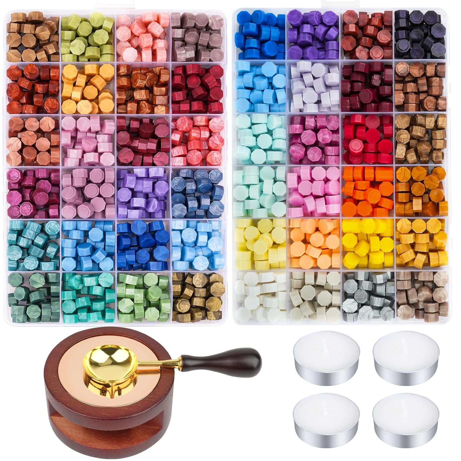 Aottom Wax Seal Kit, 48 Colors 1248 Pcs Sealing Beads with Melting Pot, Spoon, Tea Light Candles, Wax Seal Stamp Kit for Wedding Invitation, Gifts, Envelope, Letter Stamp Sealing and DIY Craft