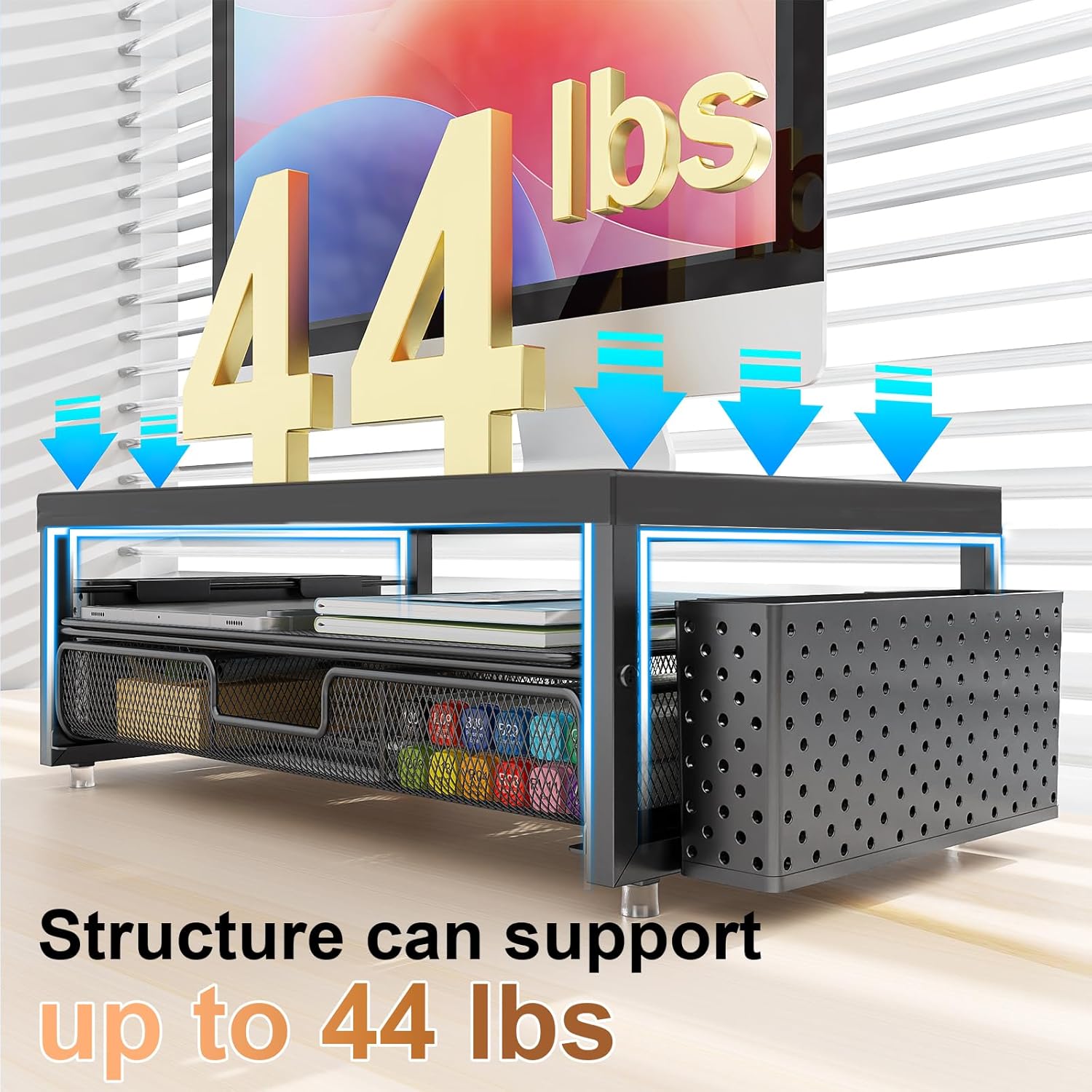 - 【Organized Storage】This desk monitor stand/organizer features two tiers of storage for files and notes. Equipped with two pen holders and a drawer , it effortlessly organizes pens, scissors, and other desk essentials, keeping everything within reach.