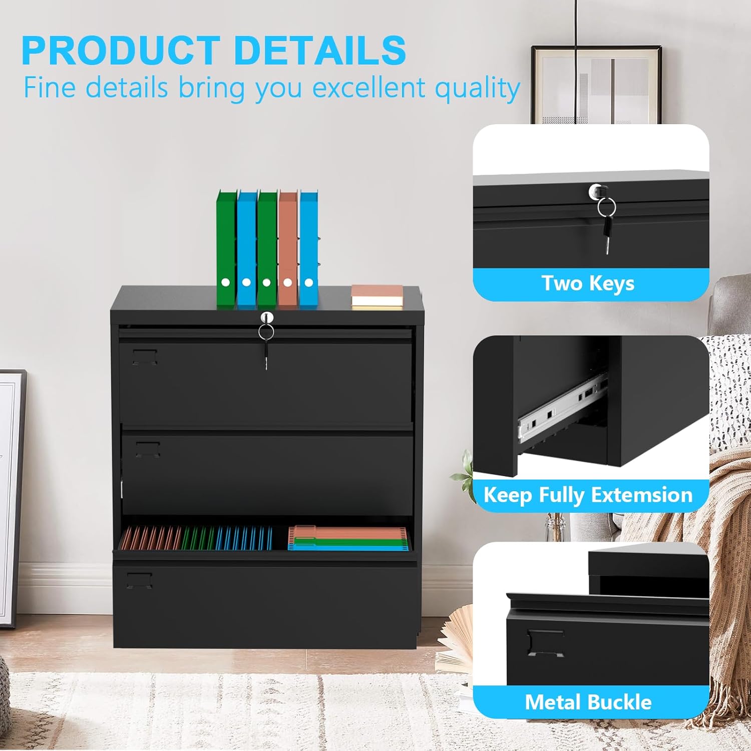 40inch Steel 3 Drawer Lateral Filing Cabinet - Lockable Metal Filing Storage, Home Office Organization, Fits Hanging Letter/Legal/F4/A4, Durable 0.6MM Coated Steel (Black)