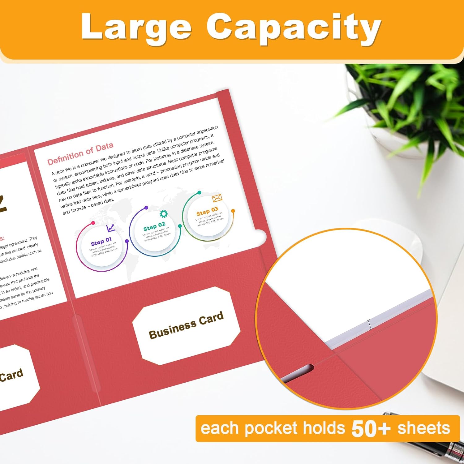 - Large Capacity: 30 pack pocket folder has two deep pockets that hold over 50 sheets of paper each. 2 business card slots for instant access to important contacts without the need for a separate business card holder.