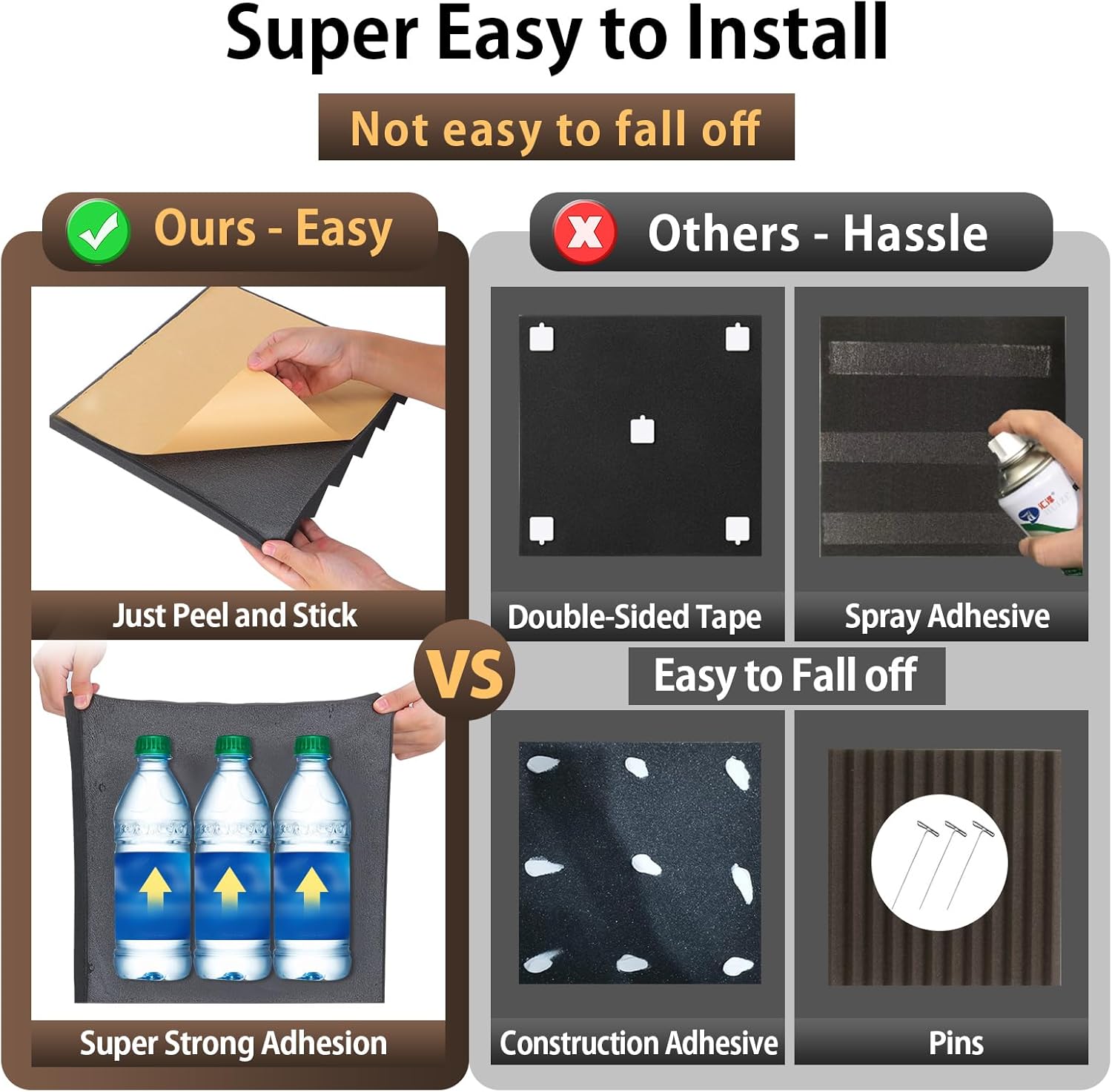 - 🧱Just Peel and Stick: Forget messy glue and complicated tools—our self-adhesive acoustic foam panels are designed for instant installation. Simply peel off the backing and press onto any flat surface. Whether it's a bedroom wall or a studio ceiling, you'll enjoy a more acoustically balanced space in minutes.