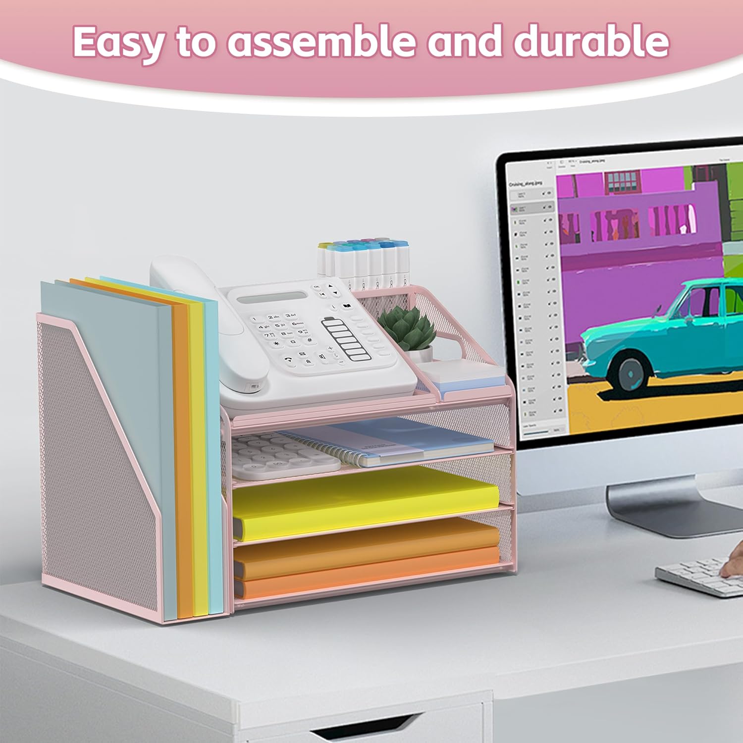 DocNest 4 Tier Paper Letter Tray File Organizer, Mesh Desk File with Handle, Workspace Desk Organizers with Pen Holder, Office Organization Storage Accessories - Pink
