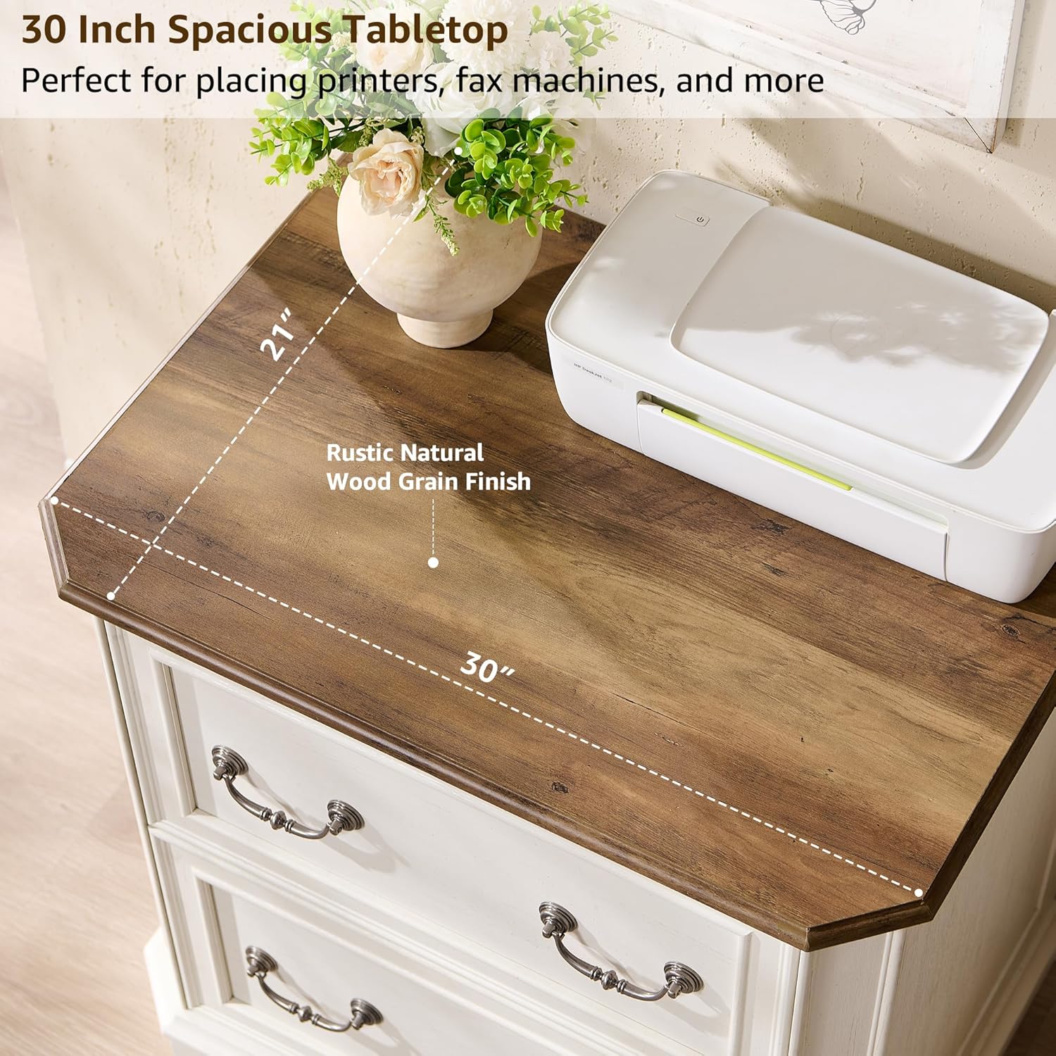 T4TREAM 2 Drawer File Cabinet-30 Wide Wooden Extended Desktop, Farmhouse Filing Cabinet with Smooth Rails, Holds Letter/Legal/A4, Hexagonal Design & Framed Drawer Fronts, Antique White