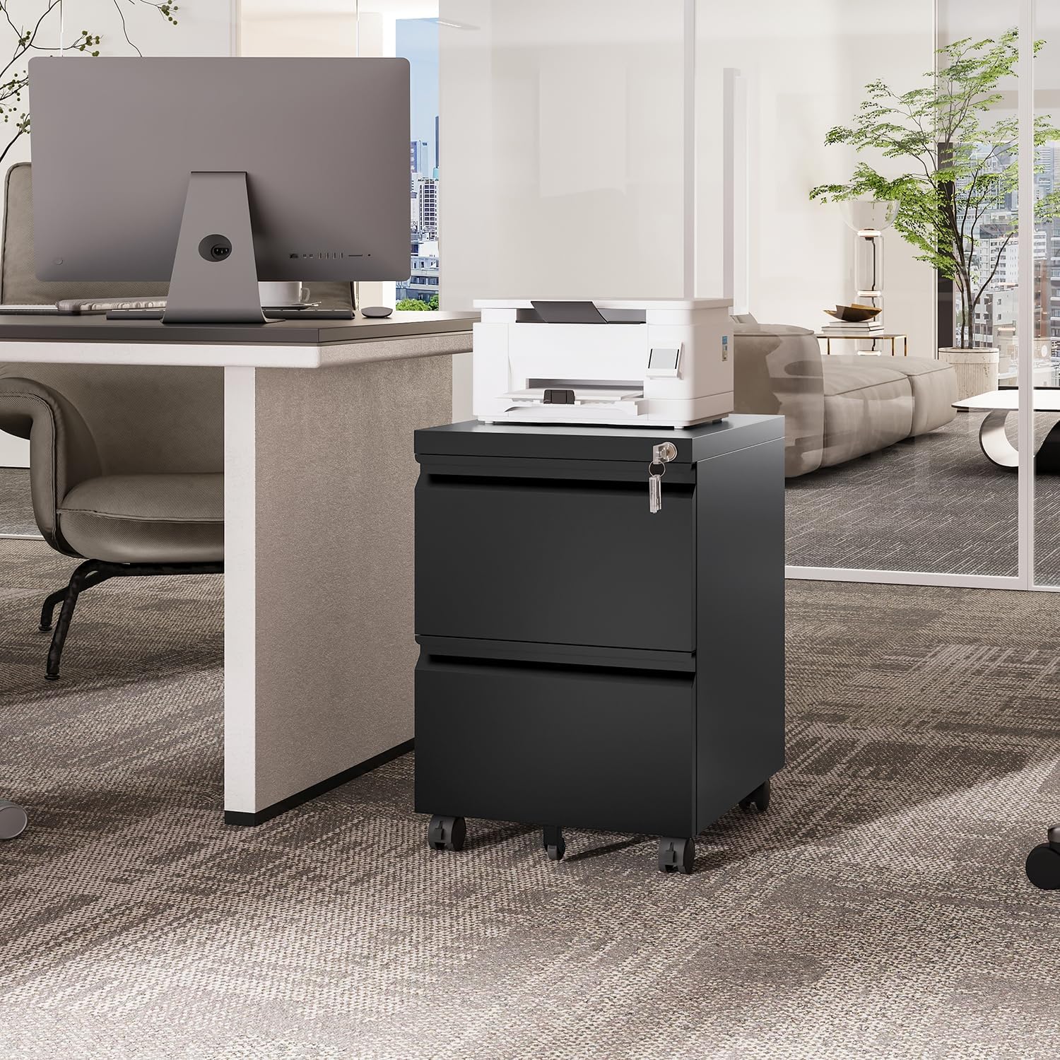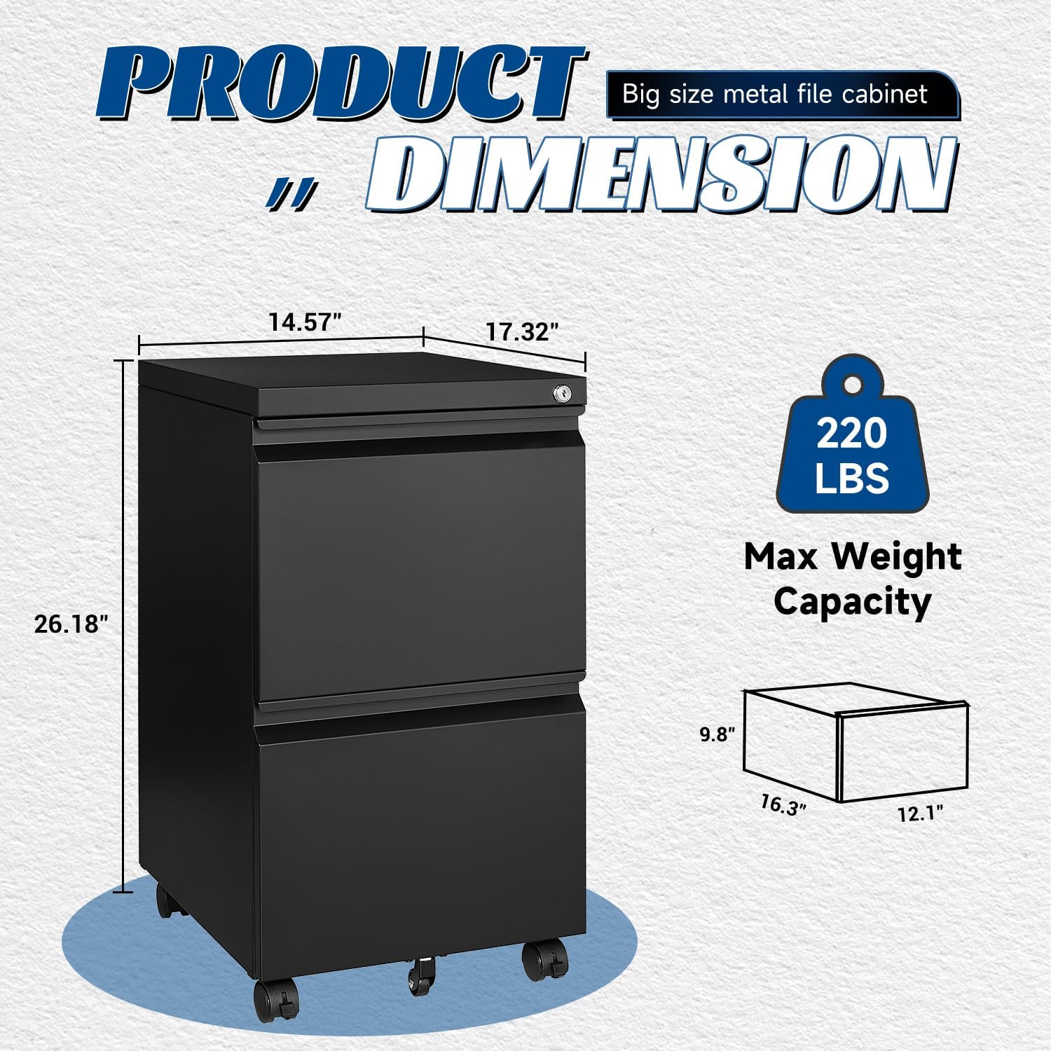 2 Drawers Vertical File Cabinet - Fully Assembled Black Under Desk Mobile Filling Cabinet Small Lockable Home Office File Cabinets for A4/Letter/Legal Size