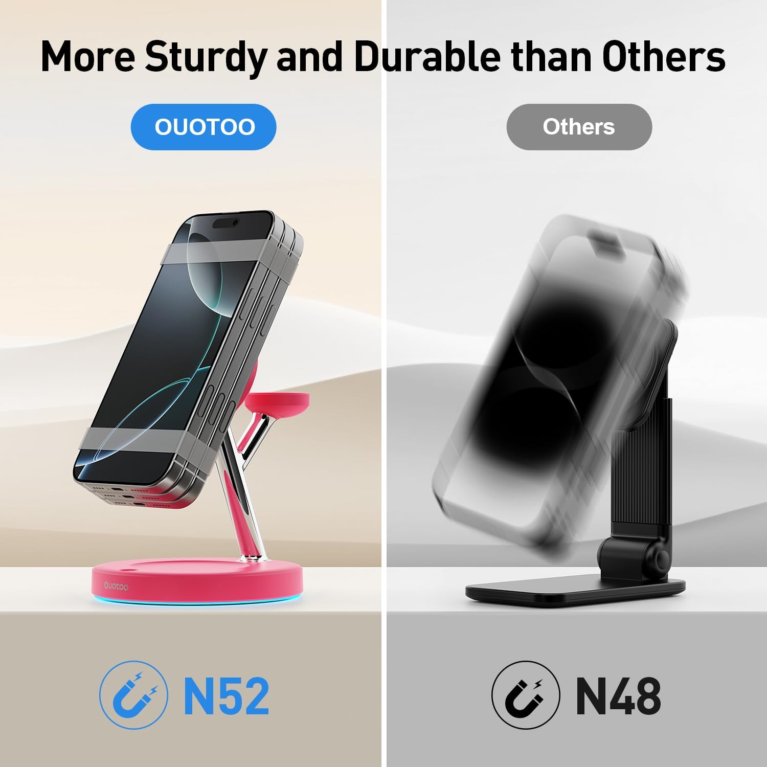 - 【Upgrade Powerful Mag-Safe Charger Stand】3 in 1 Mag-Safe charger makes fast charging safe and easy. The built-in super strong magnet makes alignment instantly and precisely, just 1 second to achieve lightning fast wireless charging. The magnetic charger can hold your iPhone horizontally and vertically, or in any directions, the phone charging area can adjust the angle by 360°, you can enjoy all your comfortable viewing from any angle.Gently touching the touch switch can turn off or on the smart LED indicator light