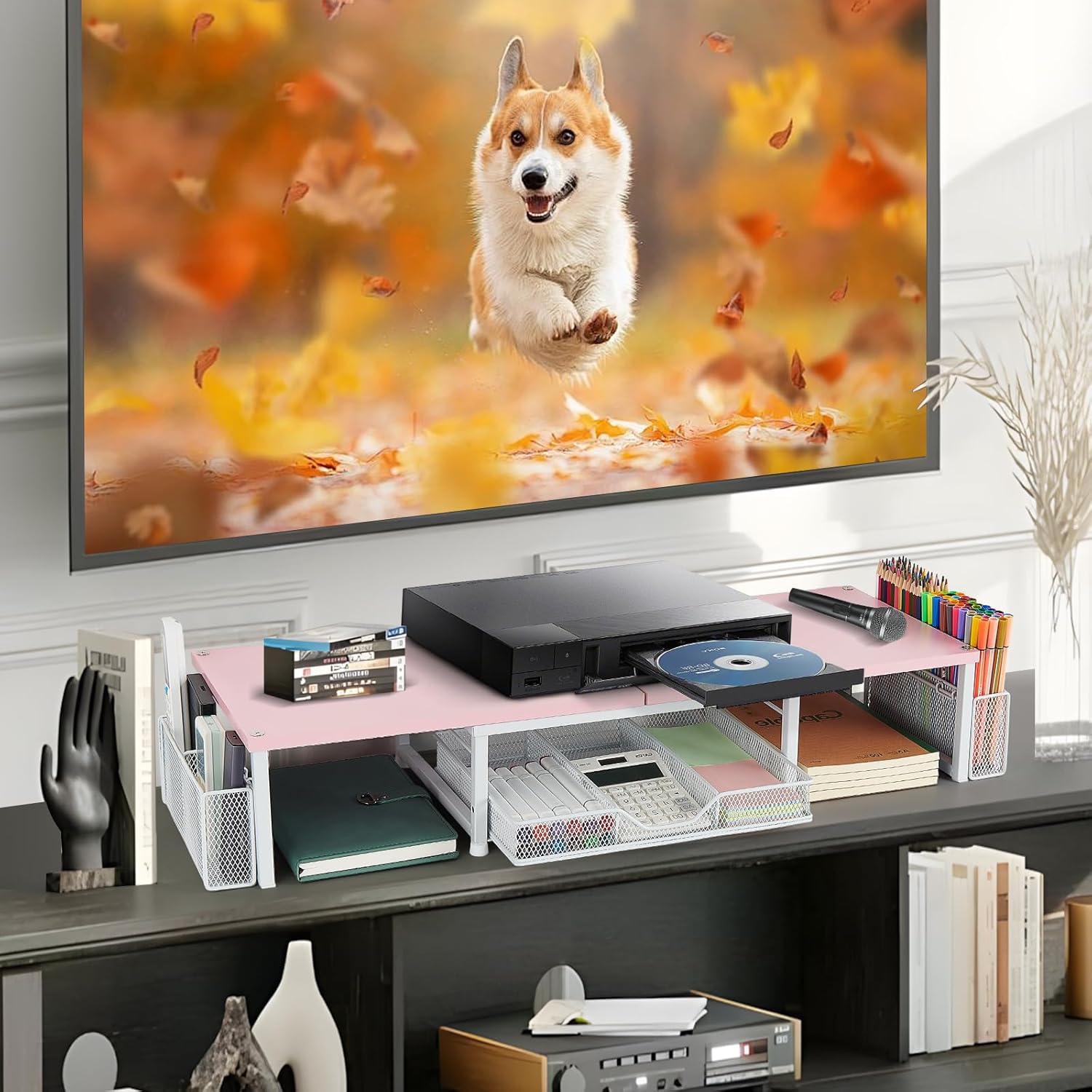 - More Storage Space: Space under the monitor stand can be used for additional desk supplies storage. A drawer tray + 2 pen holders can compartments size for different stationery. The dual monitor stand creating a clear workspace environment