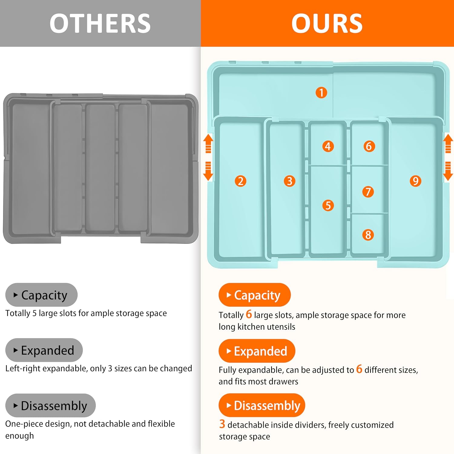 - Super Large Capacity: This silverware tray features 3 compartments in the middle and 3 expandable layers. The expandable compartments are great for storing not just large kitchen cooking utensils such as spatulas, tongs and ladles, but also small flatware and silverware, such as forks, spoons and knives. Maximize the storage capacity of your extra-wide kitchen drawers.