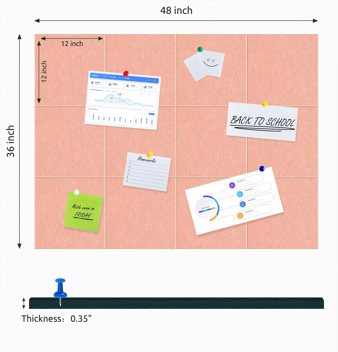 Cork Board for Wall,48"x36" 12 Pack Felt Wall Tiles with Safe Removable Adhesive Tabs, Bulletin Boards for Home Office Kitchen, Pin Board Notice Board for Photos, Memos, Pink