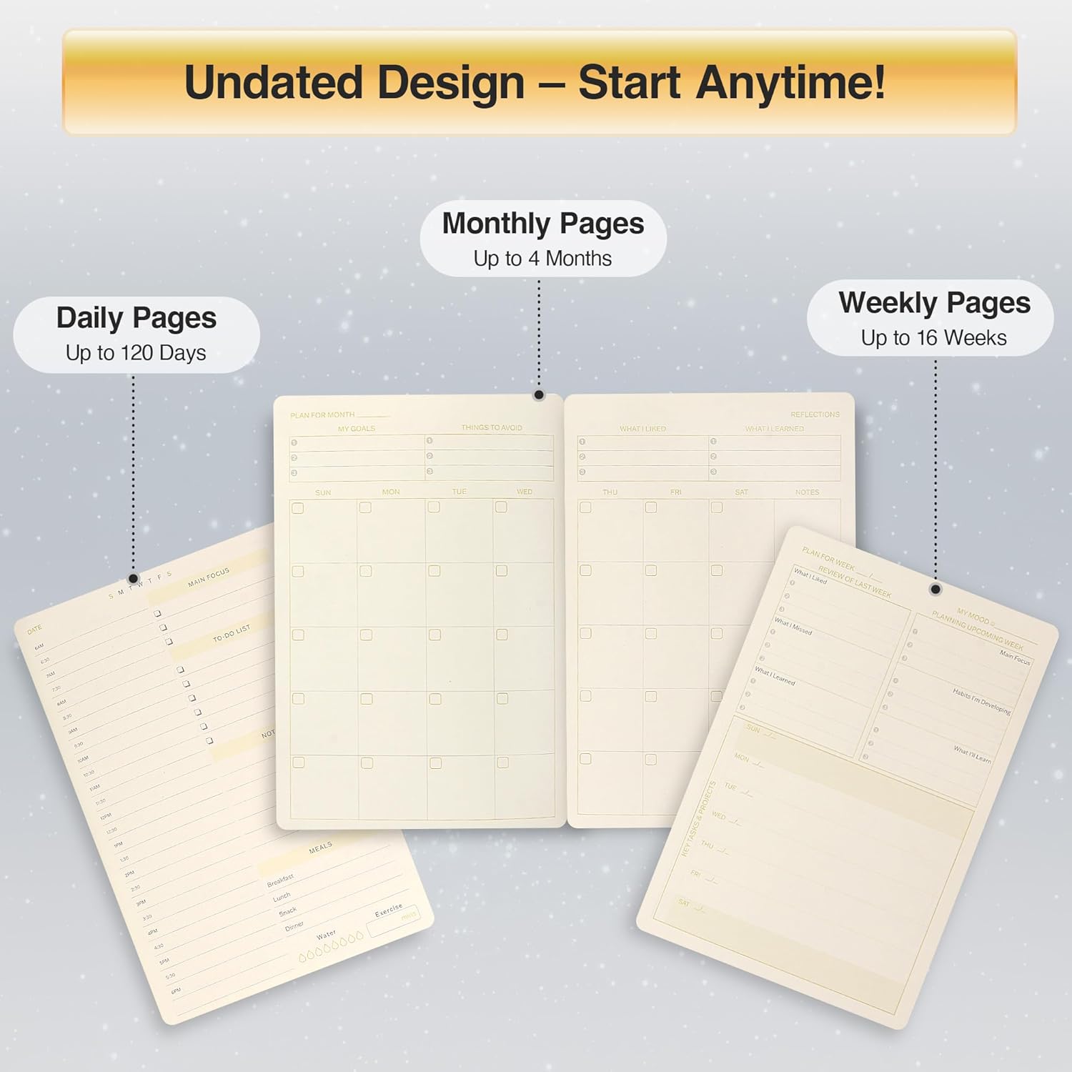 - Undated Daily, Weekly & Monthly Layouts: Flexible pages let you plan freely—supporting up to 4 months of focused, goal-oriented scheduling.