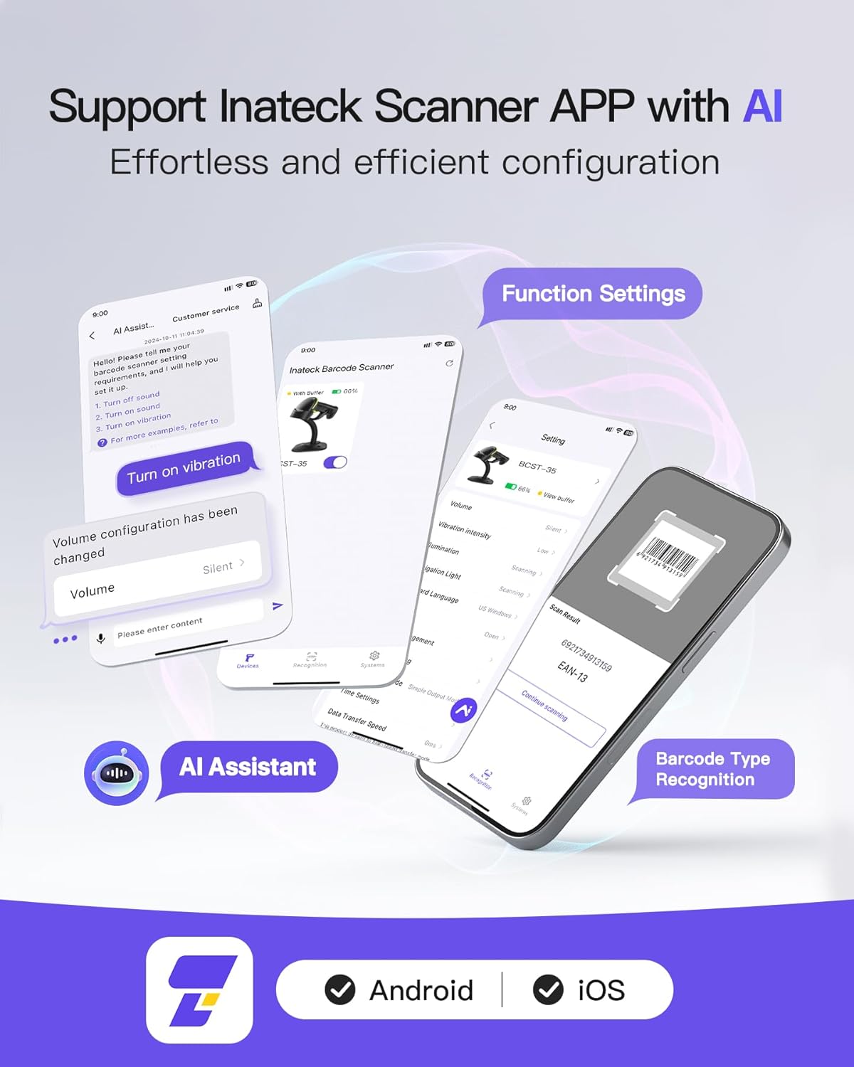 - Inateck APP Makes Configurations Easier: In the app, easily configure your barcode scanner, eliminating the frustration of losing the manual. Common functions such as barcode type recognition, Bluetooth connection and management, battery level display, alert preferences, and barcode type settings can all be effortlessly configured in the app. Stay tuned for continuous updates with more applications and features