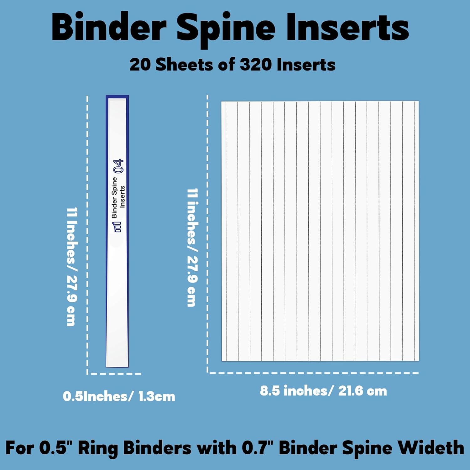 - Printable Binder Spine Inserts: The package includes 320 blank spine width white binder labels, 16 inserts per sheet, 20 Sheets for this pack. And each white binder labels are 0.5 x 11 inch/1.3x27.9cm in the 8 1/2 x 11 inch/21.6x27.9cm sheets.