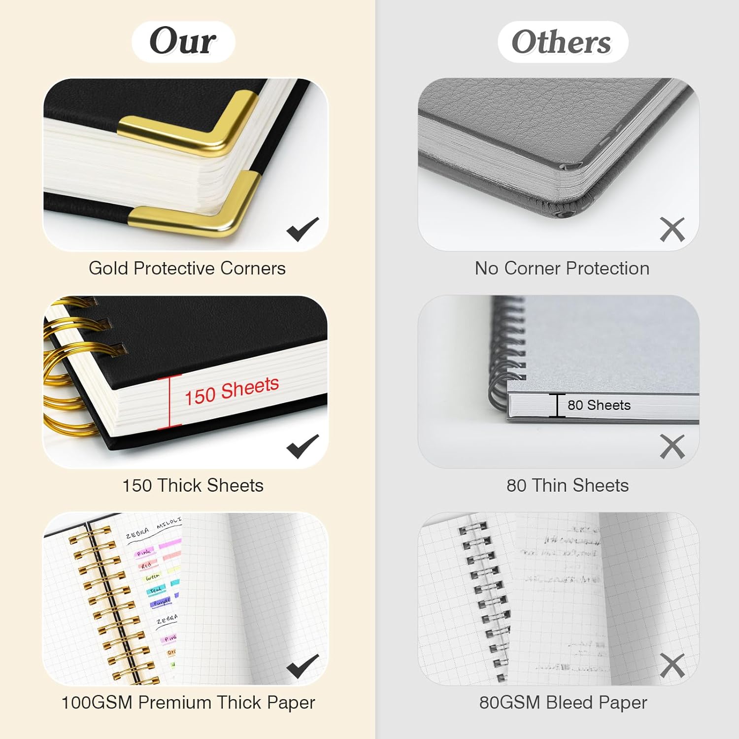 - 【Premium Leather Cover & Strong Binding】Spiral notebook showcases a luxurious leather hard cover, complete with golden corner protectors for extra durability. Its professional design not only looks stylish but is built to last. The strong metal double spiral binding allows for a full 360° lay-flat design, making writing more comfortable and efficient. Whether flipping through or laying the Subject notebook flat, this design guarantees a smooth writing experience.