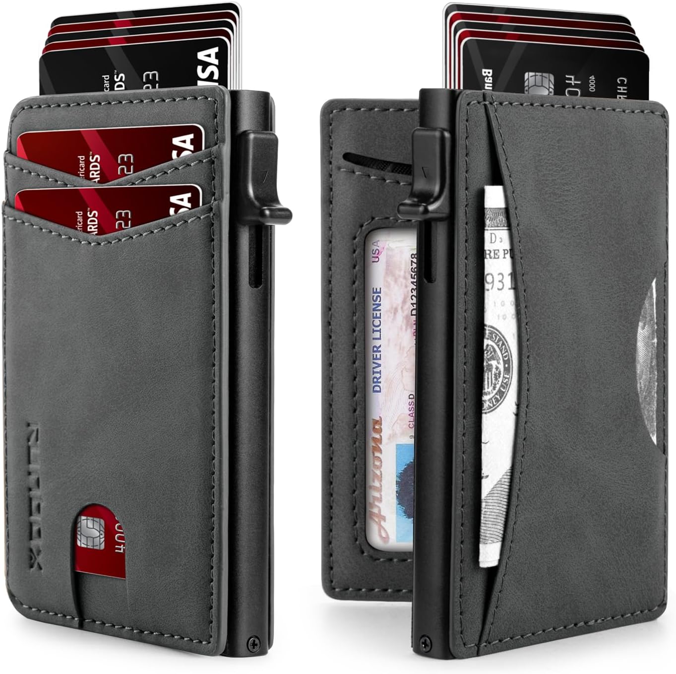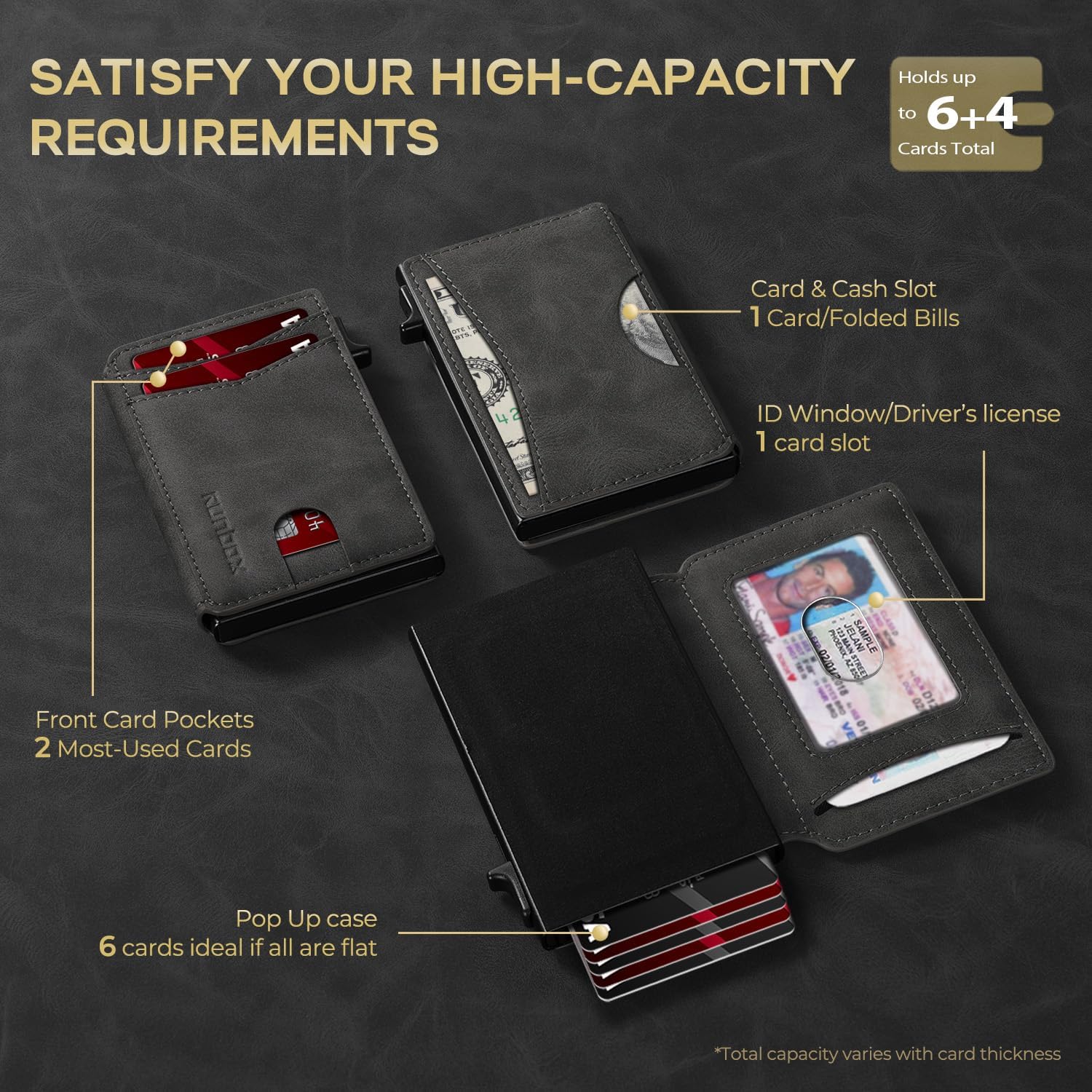 - QUICKEST ACCESS: Get instant card access with just one hand by tapping a button. The front pocket holds your 2 most-used cards, while the pop-up aluminum card holder stores 1-7 cards (The actual capacity depends on the card thickness ) . Features an ID window for your driver's license and a back pocket that fits one card or cash