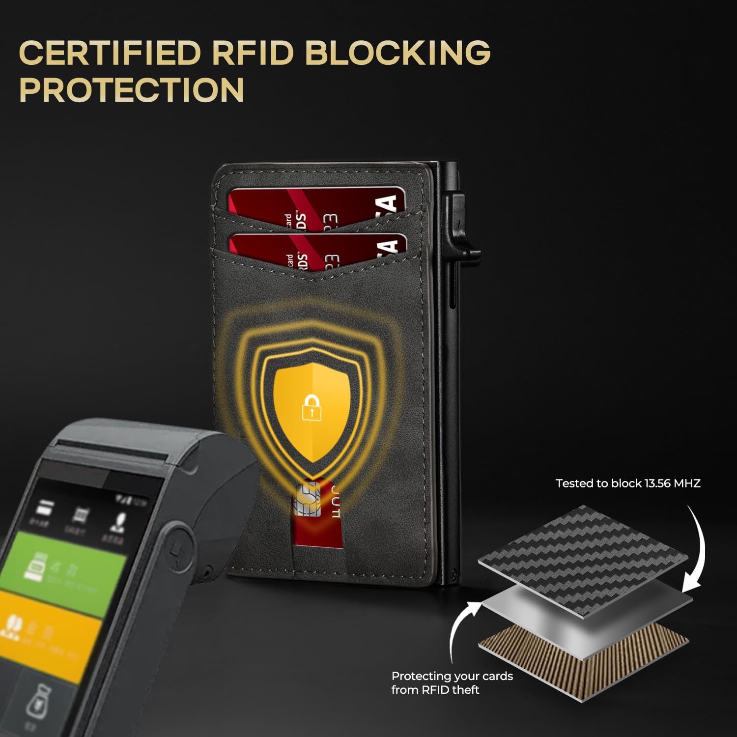 - Military-Grade RFID/NFC Protection: Built with solid aluminum shielding, this smart wallet blocks 13.56MHz signals to prevent digital theft. Safeguard credit cards and IDs from skimming devices – your data stays secure