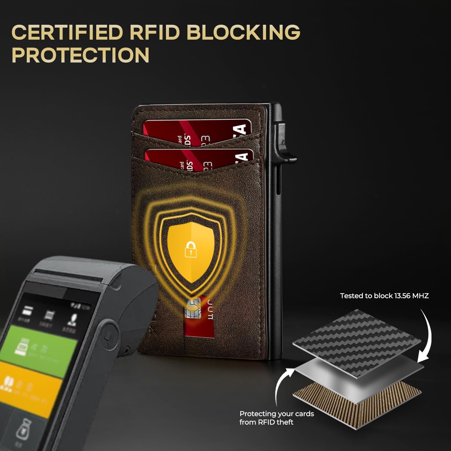 - Military-Grade RFID/NFC Protection: Built with solid aluminum shielding, this smart wallet blocks 13.56MHz signals to prevent digital theft. Safeguard credit cards and IDs from skimming devices – your data stays secure