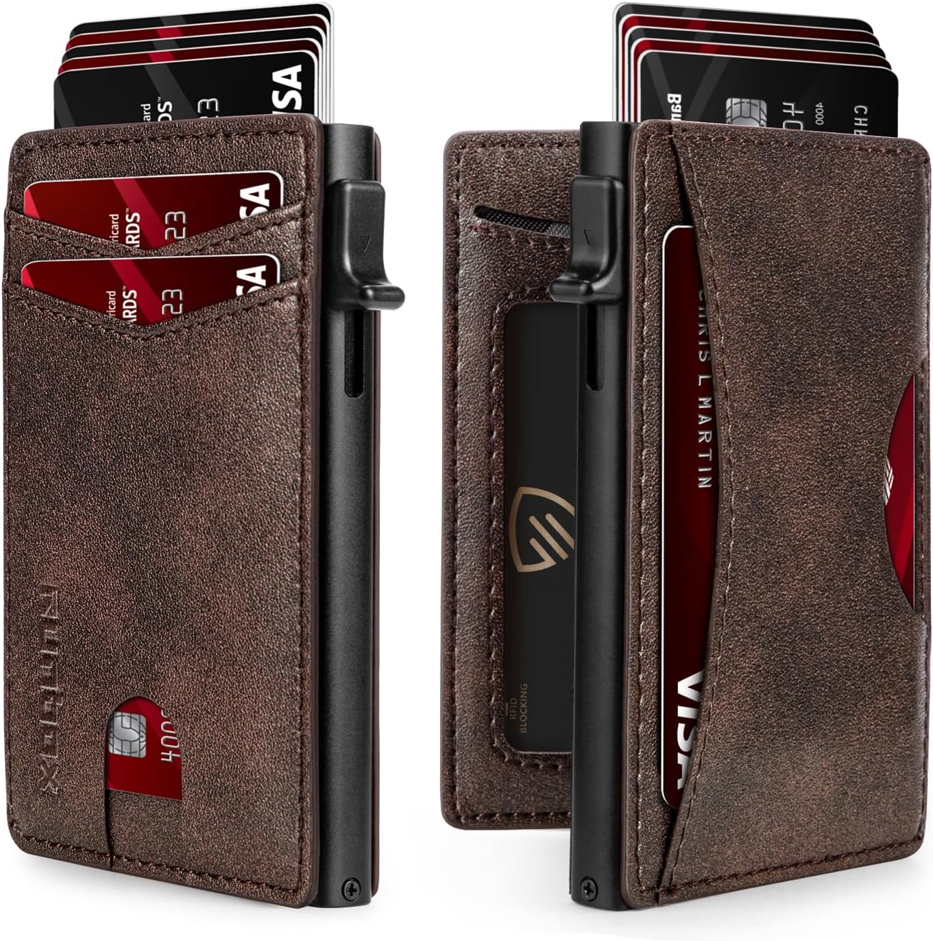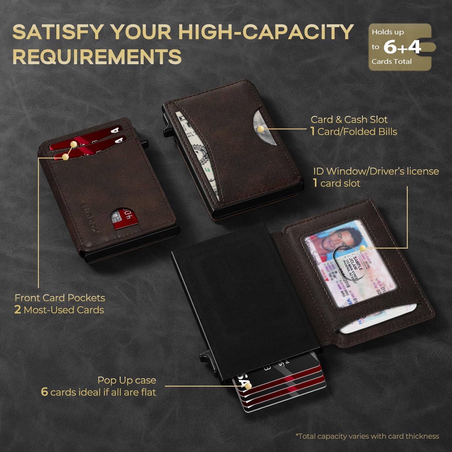 - QUICKEST ACCESS: Get instant card access with just one hand by tapping a button. The front pocket holds your 2 most-used cards, while the pop-up aluminum card holder stores 1-7 cards (The actual capacity depends on the card thickness ) . Features an ID window for your driver's license and a back pocket that fits one card or cash