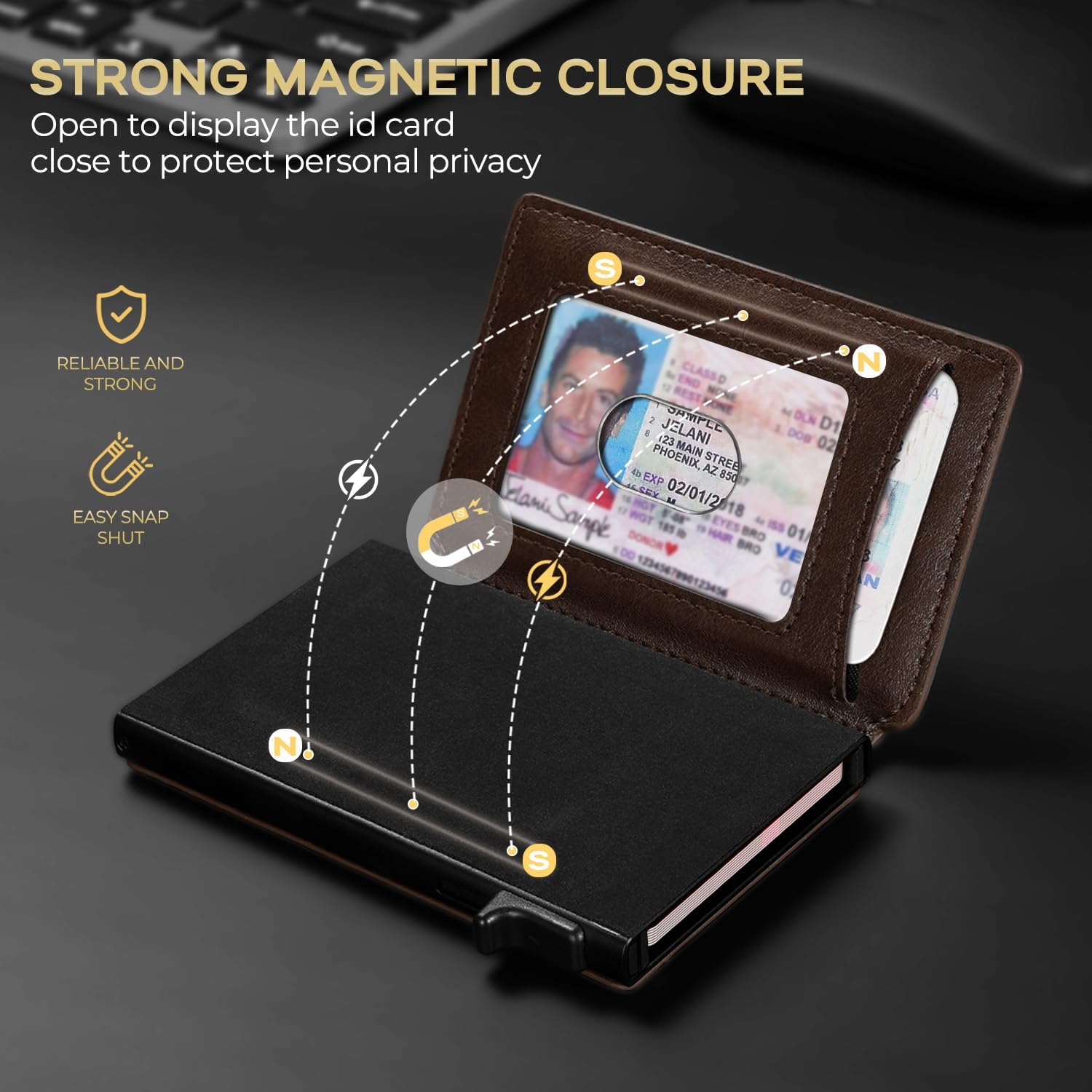 - QUICKEST ACCESS: Get instant card access with just one hand by tapping a button. The front pocket holds your 2 most-used cards, while the pop-up aluminum card holder stores 1-7 cards (The actual capacity depends on the card thickness ) . Features an ID window for your driver's license and a back pocket that fits one card or cash