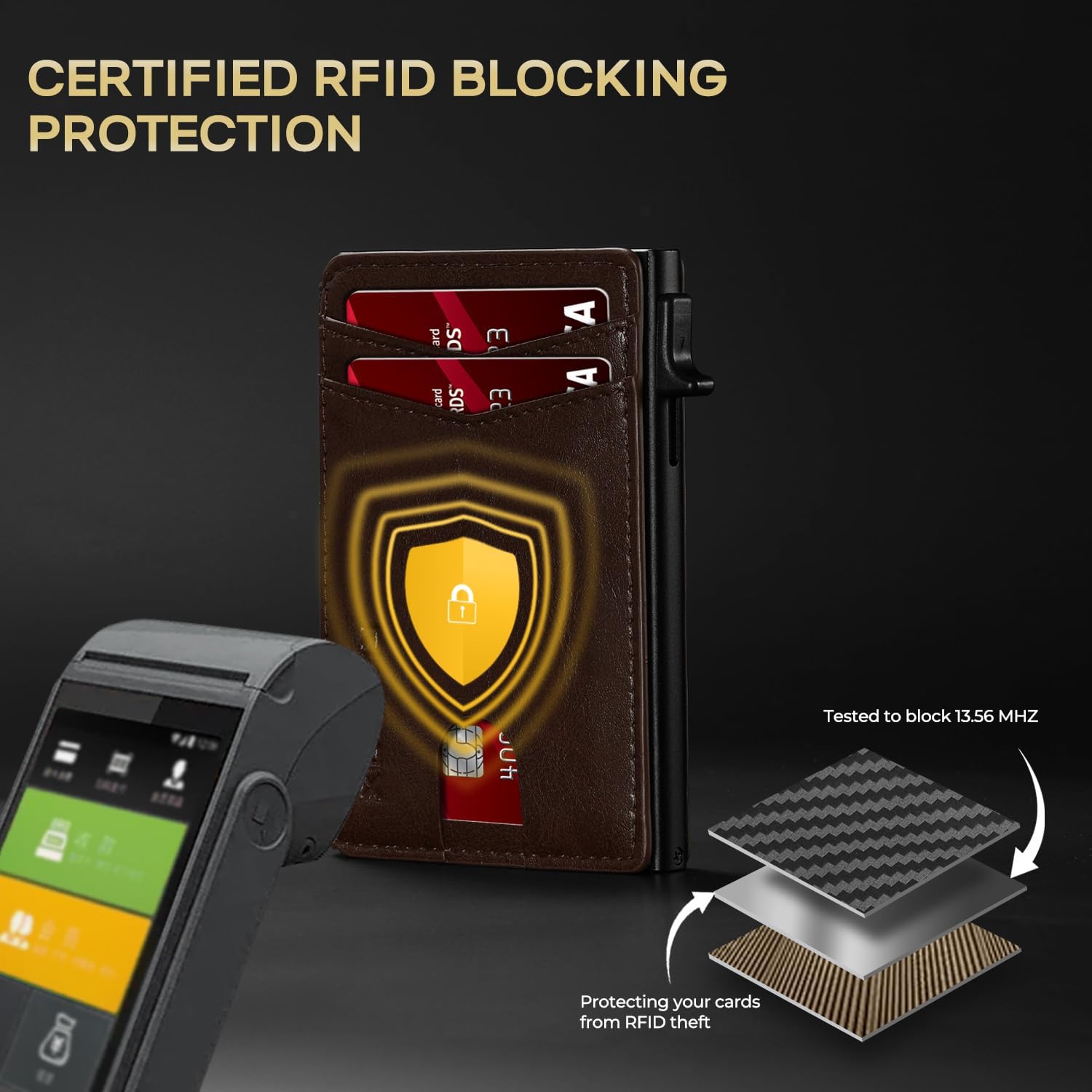 - Military-Grade RFID/NFC Protection: Built with solid aluminum shielding, this smart wallet blocks 13.56MHz signals to prevent digital theft. Safeguard credit cards and IDs from skimming devices – your data stays secure