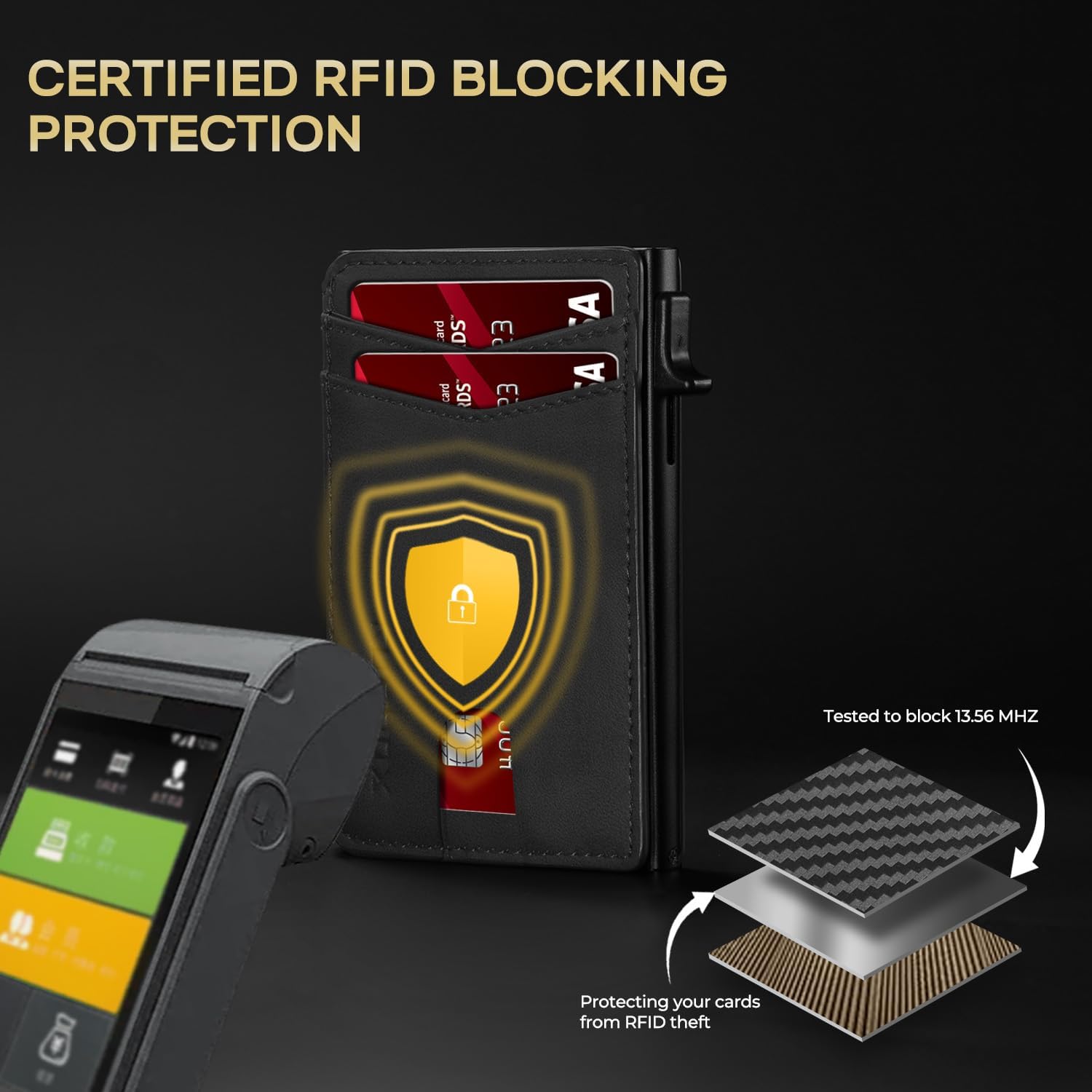 Slim Card Wallet for Men with ID Window – Minimalist RFID Wallet, Pop-Up Function, Ultra Thin Design, Metal Business Card Case Holds 8+ Cards, Gifts for Men, Men's Accessories