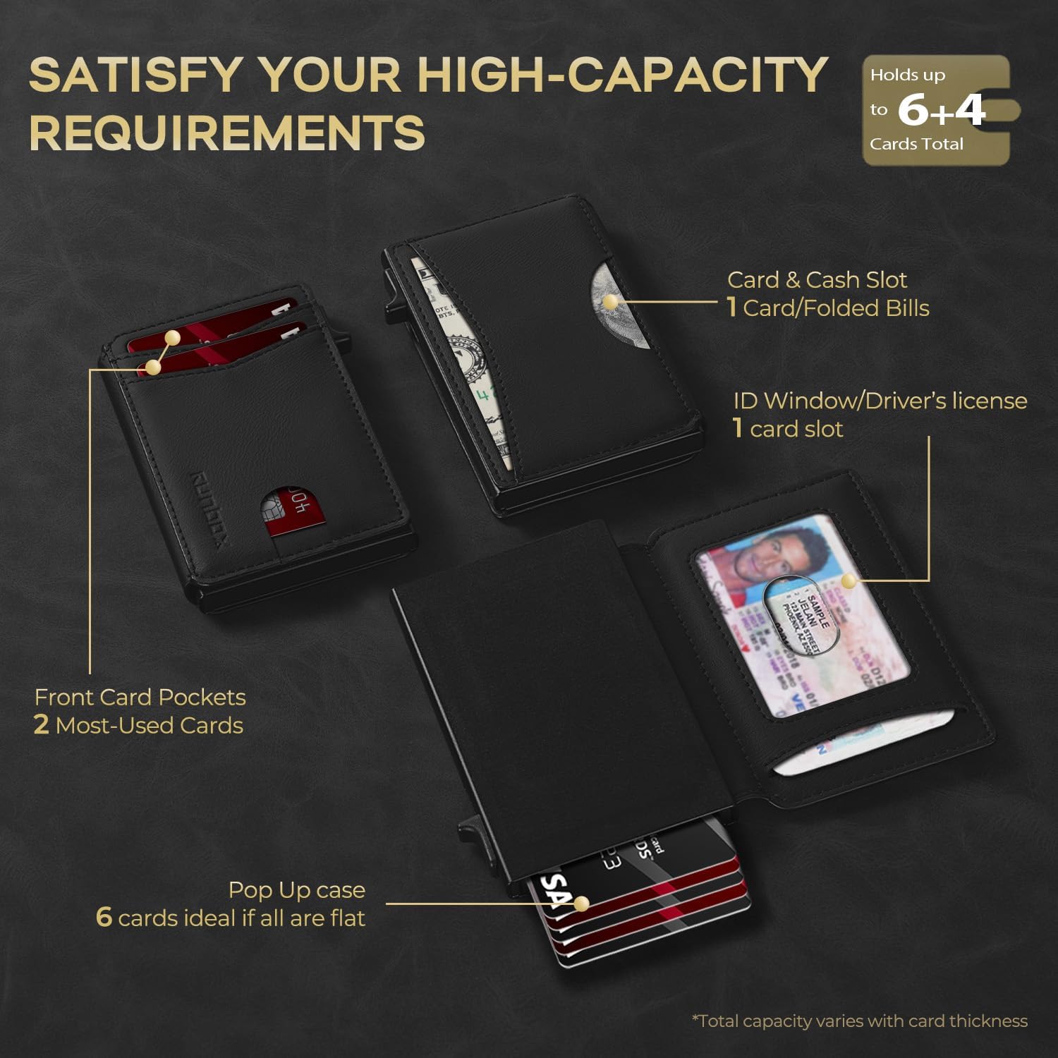 - QUICKEST ACCESS: Get instant card access with just one hand by tapping a button. The front pocket holds your 2 most-used cards, while the pop-up aluminum card holder stores 1-7 cards (The actual capacity depends on the card thickness ) . Features an ID window for your driver's license and a back pocket that fits one card or cash