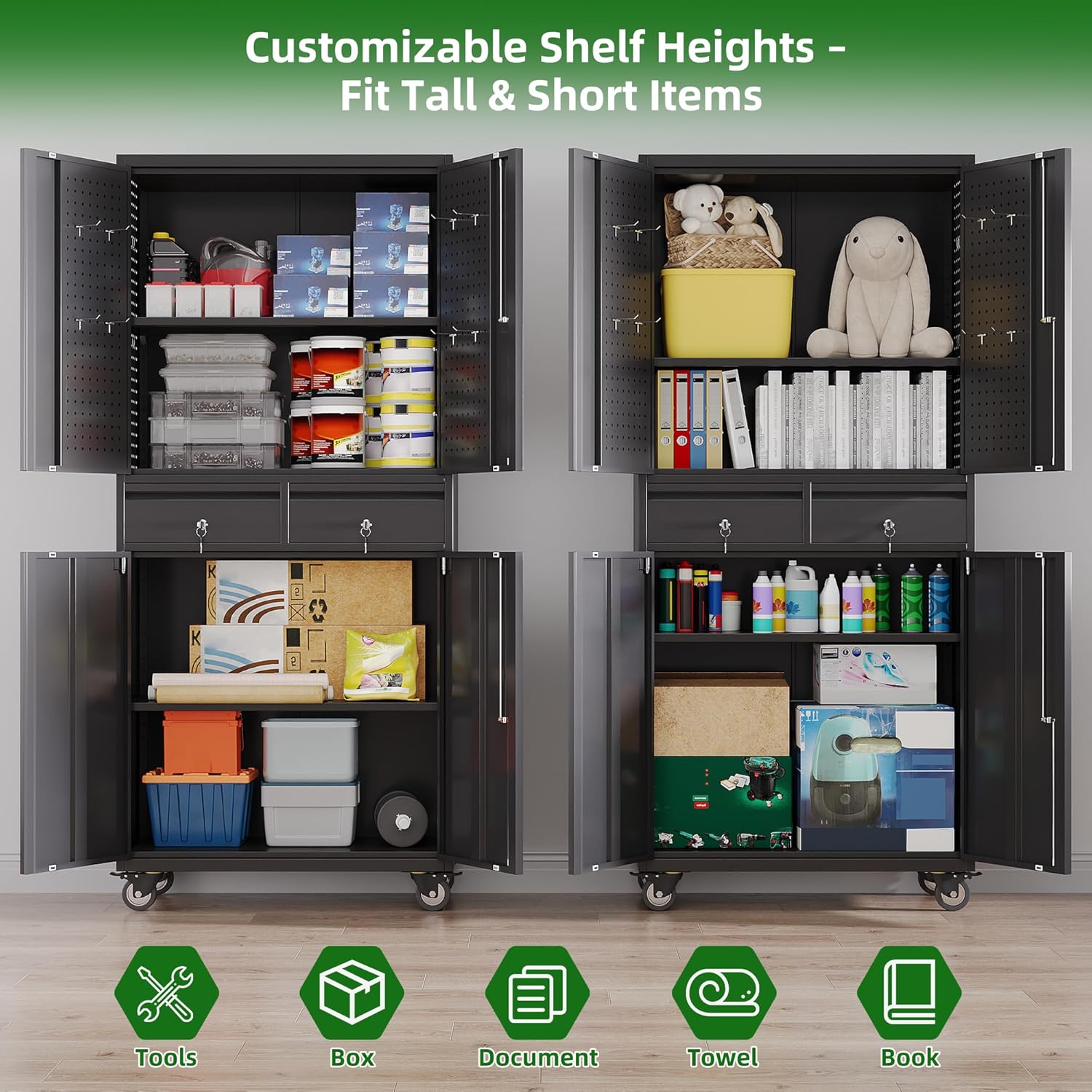 - 【Adjustable Shelves】 Garage storage cabinet with Wheels has 2 adjustable shelves. The shelves can be adjusted up and down to the desired position for your household items, tools, and other items.