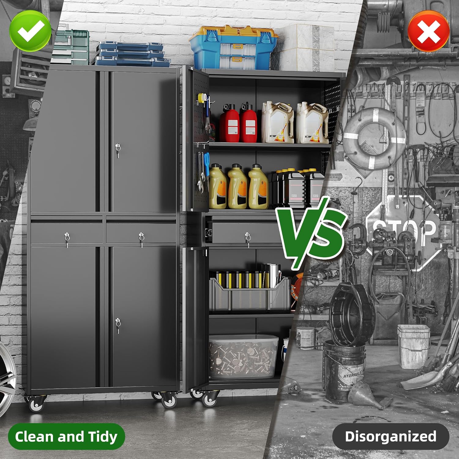 - 【 High-Quality Metal】Garage storage cabinet with Wheels is made of high-quality steel, with a high-temperature curing and hardening layer, an anti rust treatment layer, and an environmentally friendly powder electrostatic coating process,They have strong load-bearing capacity.