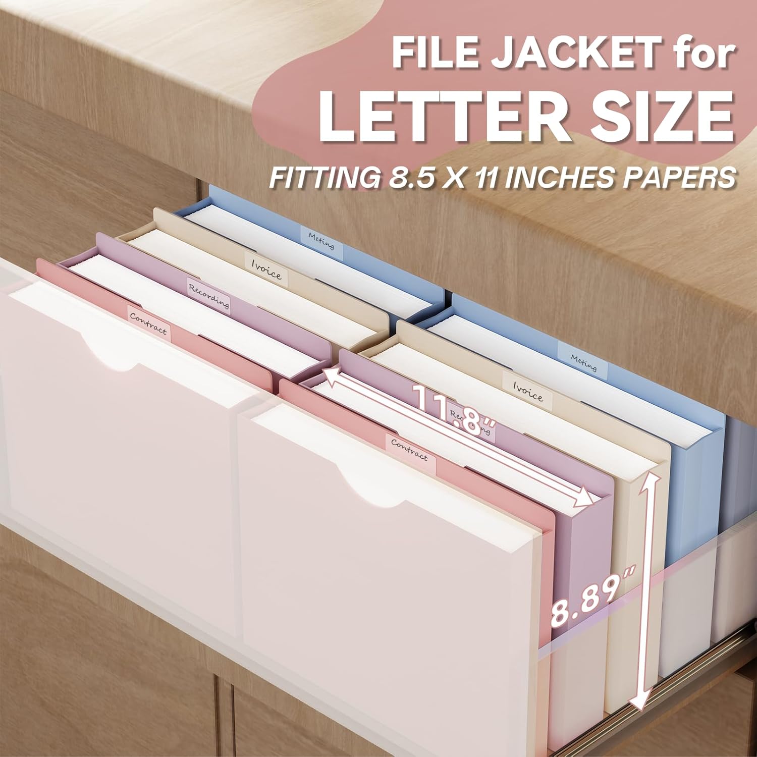 - 【LETTER SIZE】: The manila file pocket folders fit letter size documents and files up to 8.5 x 11-inches, contains 12 plastic manilla file jackets and14 colored blank labels.