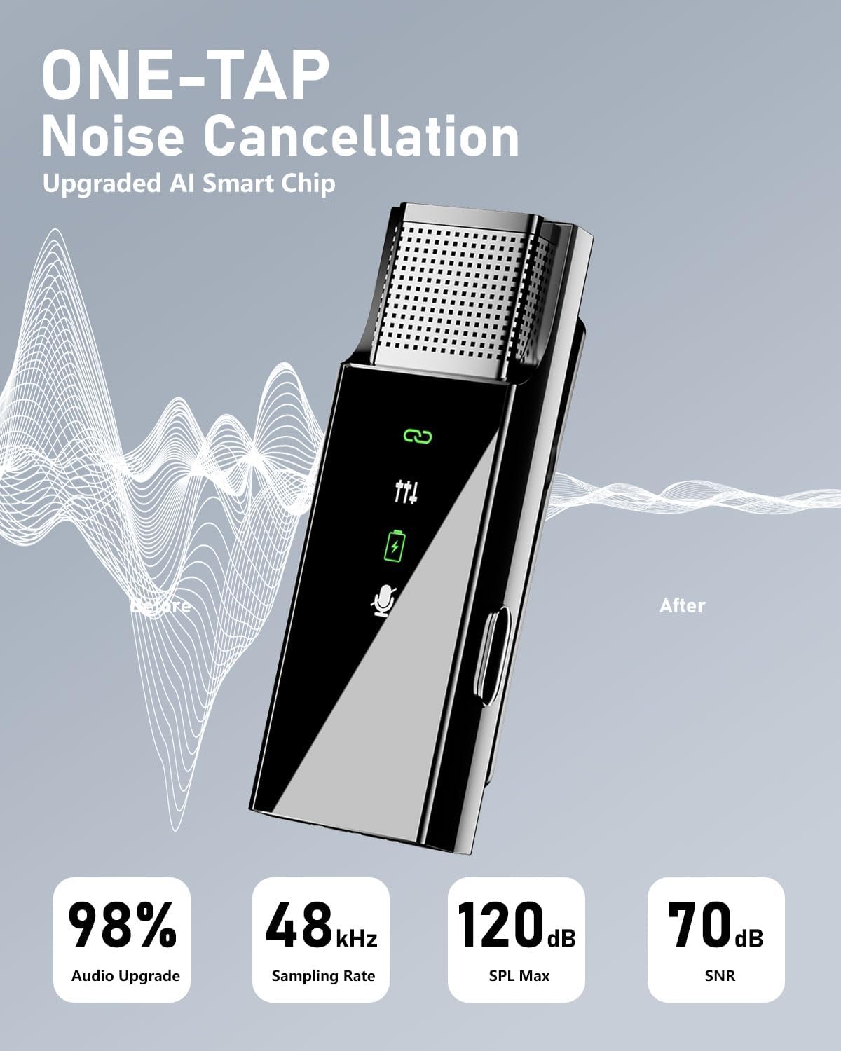 - One-Tap Magic & Quality Audio: With the revolutionary One-Tap Noise Cancellation feature, instantly banish background distractions, ensuring crystal-clear recordings every time. Powered by an Upgraded Smart Chip, it delivers a staggering 98% Audio Upgrade, capturing CD-grade lossless audio at 48kHz sampling rate with 120dB SPL Max and 70dB SNR. Restore every vocal detail, from the softest breath to the most powerful note, and enjoy sharper clarity like never before.
