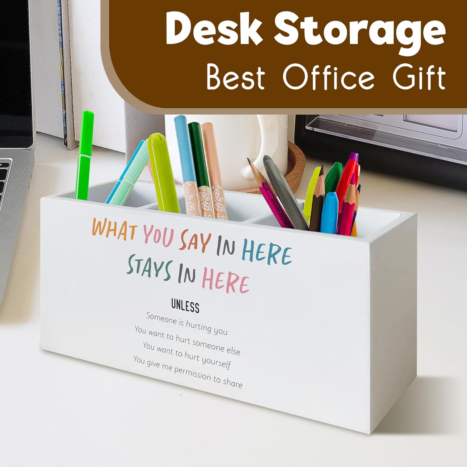 Mental Health Gifts Pen Holder for Desk, Mental Health Office Decor, What You Say in Here Stay in Here Wooden Pen Pencil Holder Organizer for Therapist Counselor Office Desk Accessories
