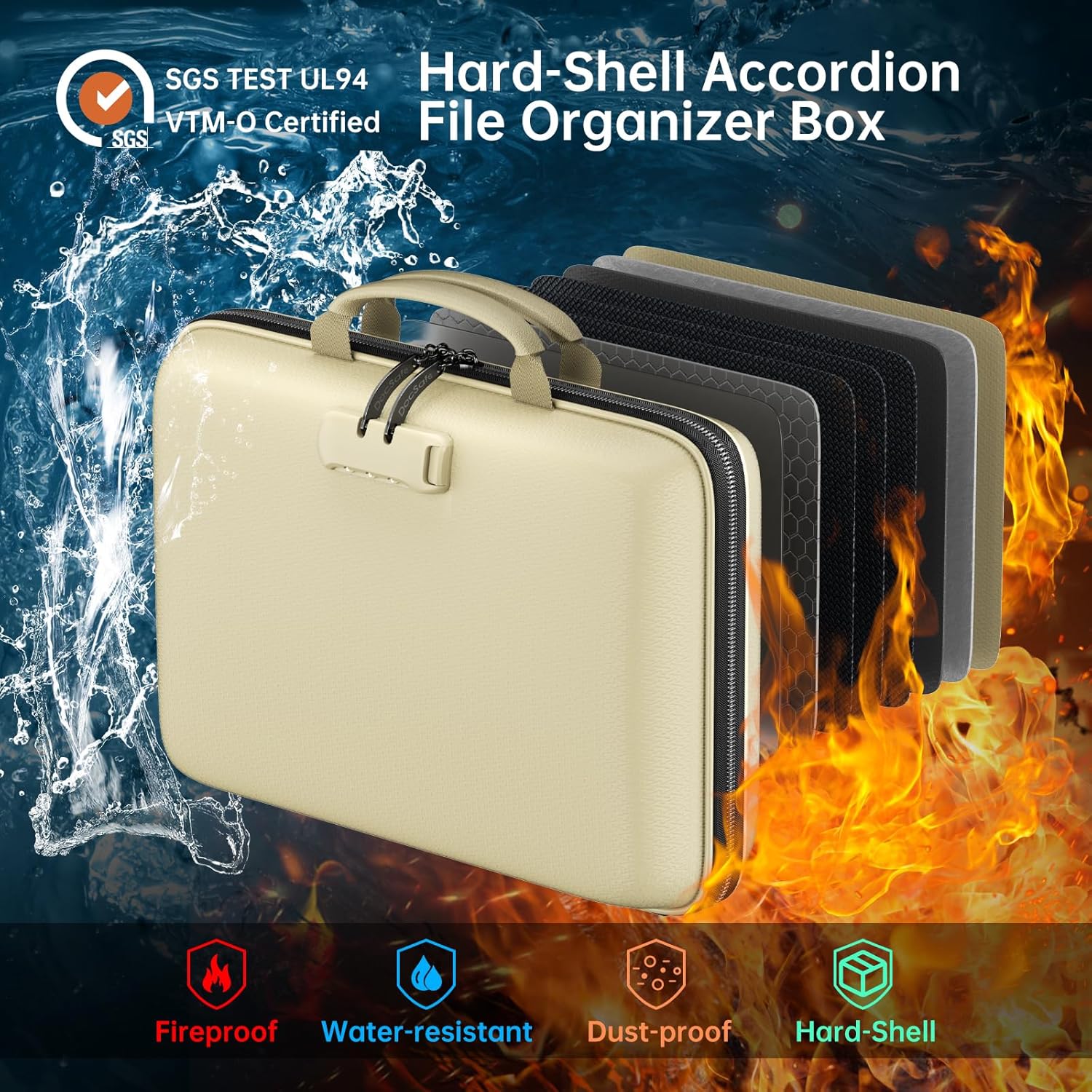 DocSafe Fireproof File Organizer with Lock, Hard-Shell Case Fireproof Document Box with 13 Pocket Accordion File Folder, Portable Home Office Travel Safe Storage for Important Documents Laptop Beige
