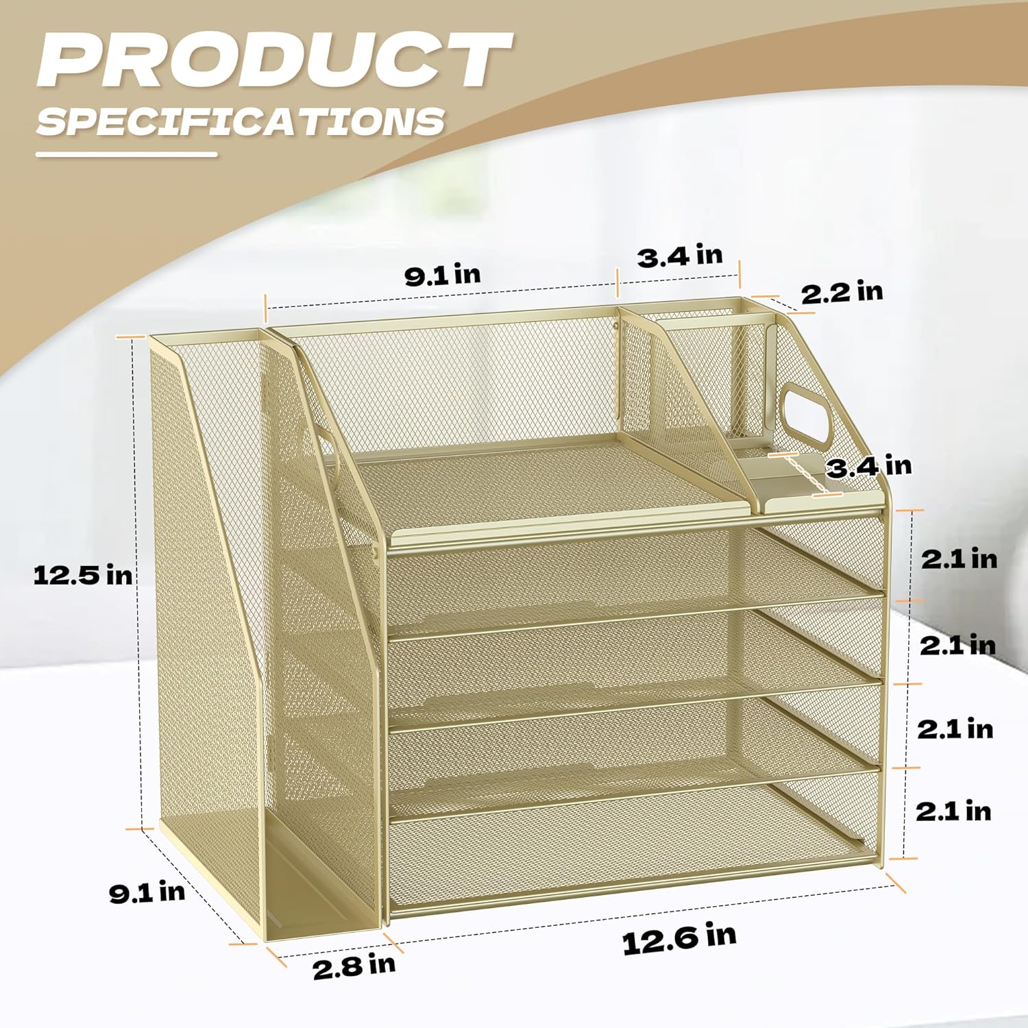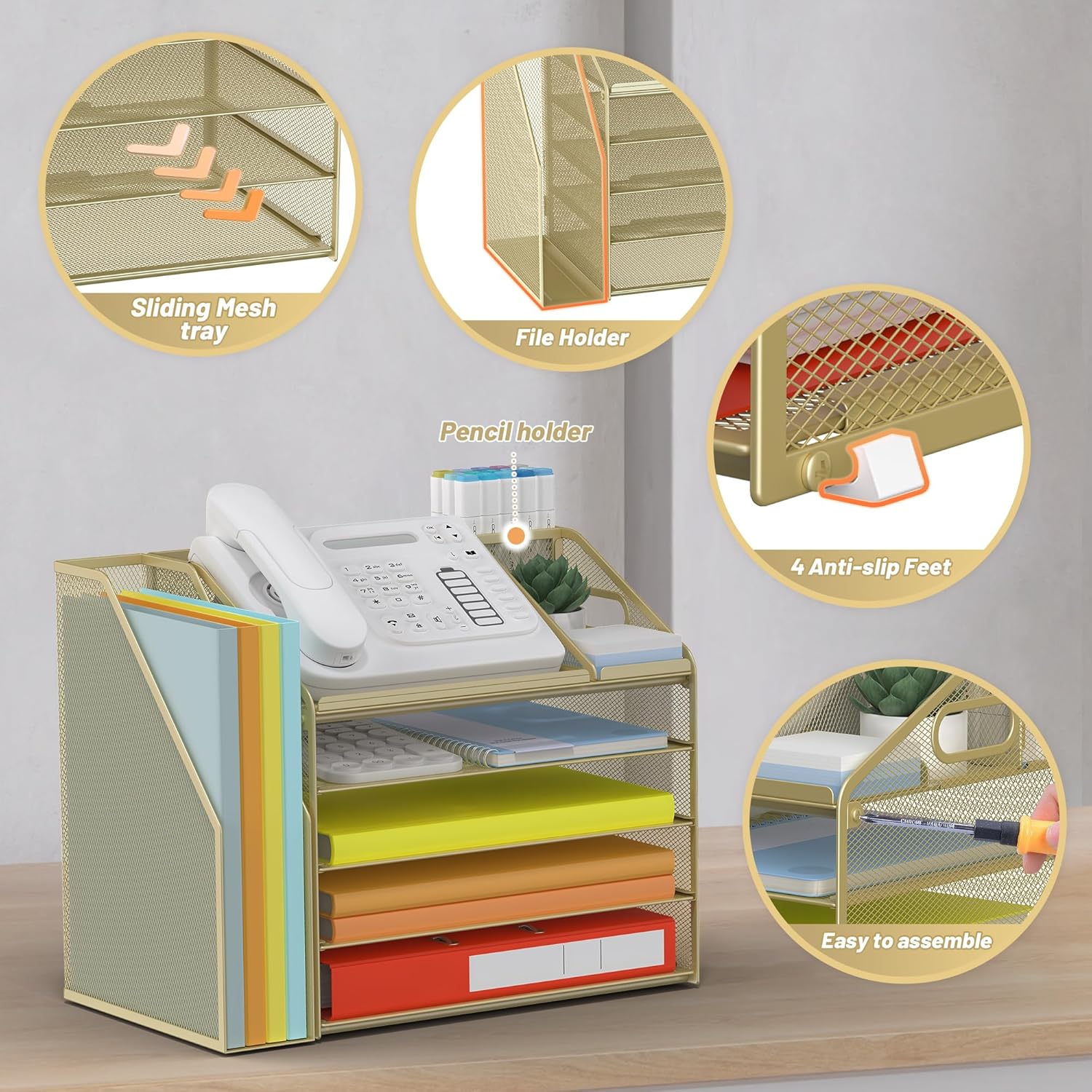 - 5 Tier Organization with Pen Holder: This Gold Yellow desk organizer boasts a 5-tier design for efficient sorting of your papers, letters, and other office supplies, along with a dedicated pen holder. It's perfect for maintaining a tidy and uncluttered workspace. The desk file organizer is an essential desk accessory that contributes to an orderly and professional atmosphere