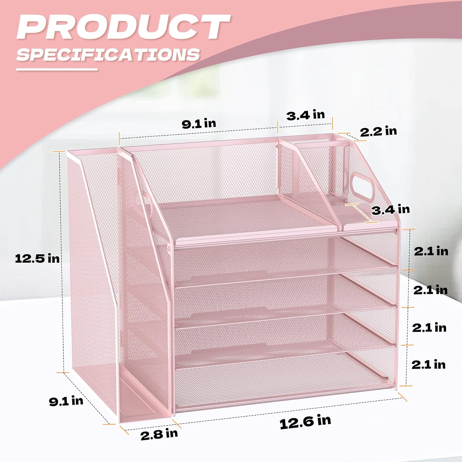 - 5 Tier Organization with Pen Holder: This Pink desk organizer boasts a 5-tier design for efficient sorting of your papers, letters, and other office supplies, along with a dedicated pen holder. It's perfect for maintaining a tidy and uncluttered workspace. The desk file organizer is an essential desk accessory that contributes to an orderly and professional atmosphere