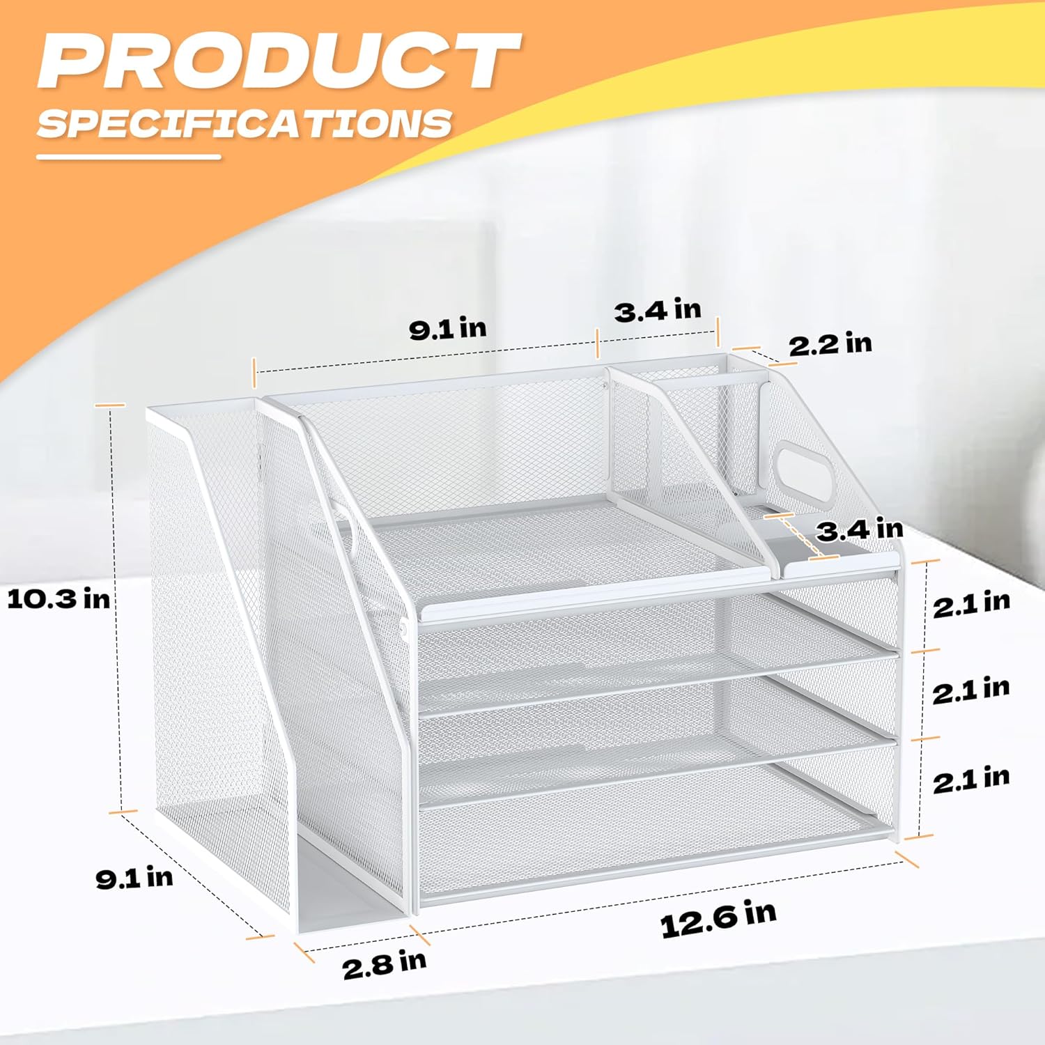 - 4 Tier Organization with Pen Holder: This White desk organizer boasts a 4-tier design for efficient sorting of your papers, letters, and other office supplies, along with a dedicated pen holder. It's perfect for maintaining a tidy and uncluttered workspace. The desk file organizer is an essential desk accessory that contributes to an orderly and professional atmosphere